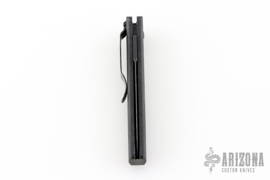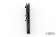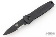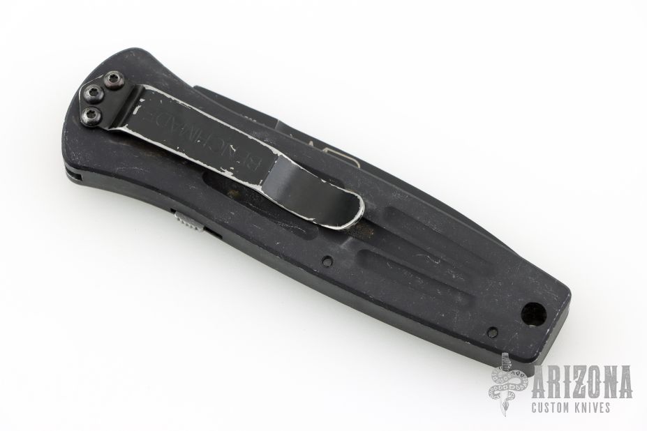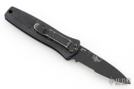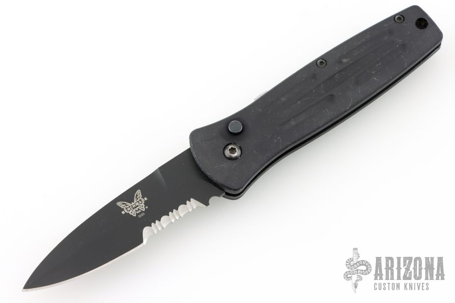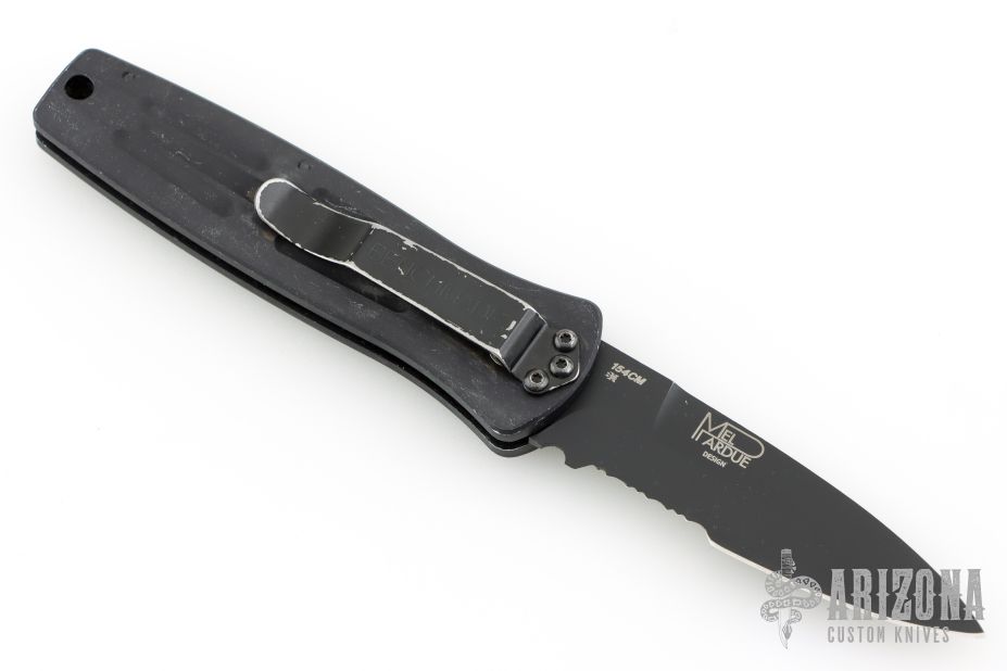 This 3550 Mel Pardue designed side opening auto from Benchmade has a black spear point partially serrated blade with a false top edge. Handle is matte black finished aluminum with milled contours, spine-thumb safety button, black stainless steel tip down clip, and lanyard hole. Has scuffs, otherwise good user condition.