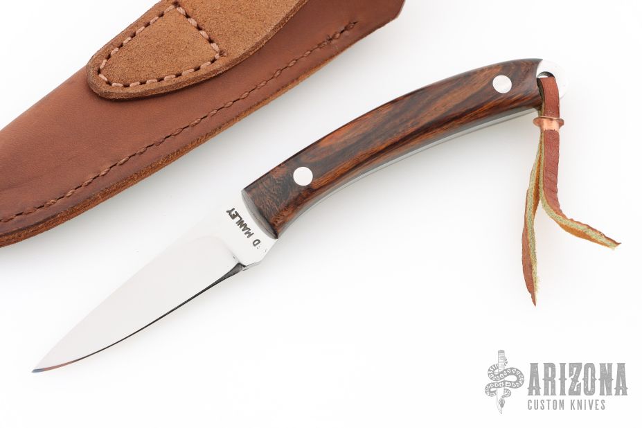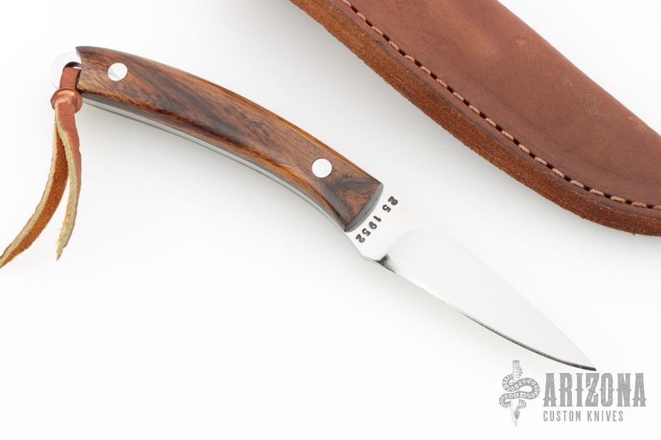 This Utility by Manley has a mirror polished blade with .126" blade stock and .677" depth, full tang construction. The handle has desert ironwood scales with stainless steel pins. Comes with a brown leather sheath. Dated '25 and #1952. Excellent condition.