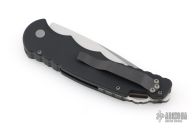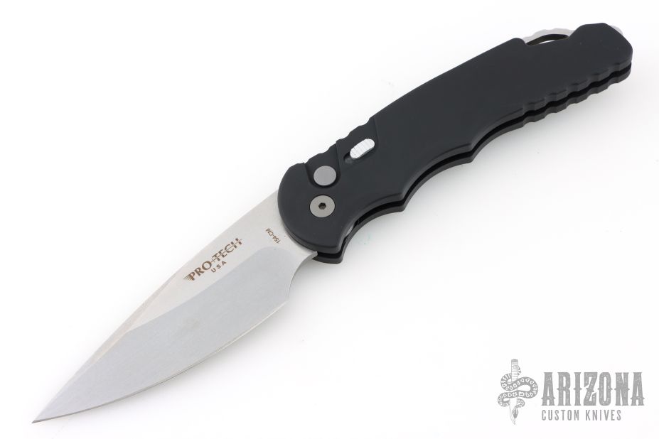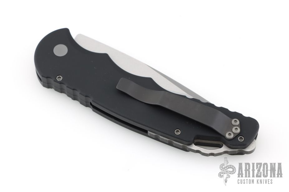 This Tactical Response 4 by Pro-Tech has a stonewashed blade with a plain edge, and a black aluminum handle. Black stainless steel clip. Steel glass breaker. Secondary safety switch. Comes with original box, sheath and papers. Has a scuff or two otherwise the knife is in excellent condition.