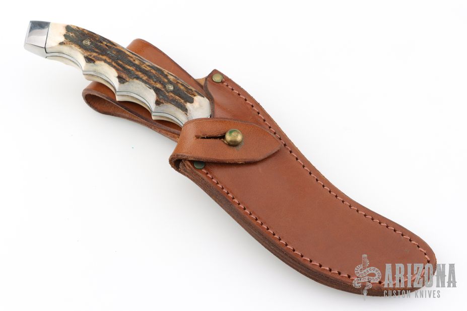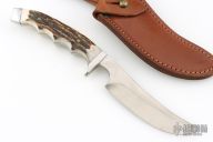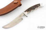 This integral Skinner by JA Henckels features a satin finished blade with notched thumbrest, .245" blade stock and 1.112" blade depth, integral bolsters with stag scales. Comes with original box, and leather belt sheath. Has a couple light scratches, excellent condition otherwise.