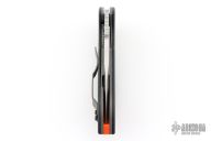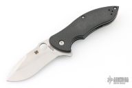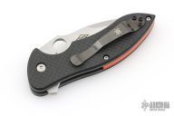 This Rubicon 2 is a Peter Carey design by Spyderco, it features a satin finished spear point blade with thumbhole, notched thumbrest and flipper. The handle has carbon fiber scales with orange G-10 backspacer, tumbled titanium liners and a tip up stainless steel clip. Nice detent, lockup and blade seating. Comes with original box and papers. New condition.