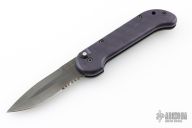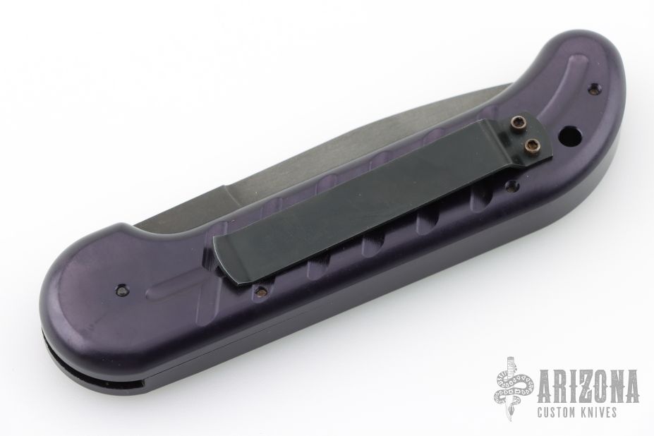 This Ox Enterprises / Charles Ochs coil-spring automatic features a black partially serrated blade and black anodized aluminum frame, tip up stainless steel clip. Strong and fast opening. Nice function. Excellent conditon. Comes with original box.