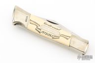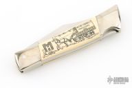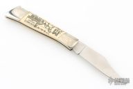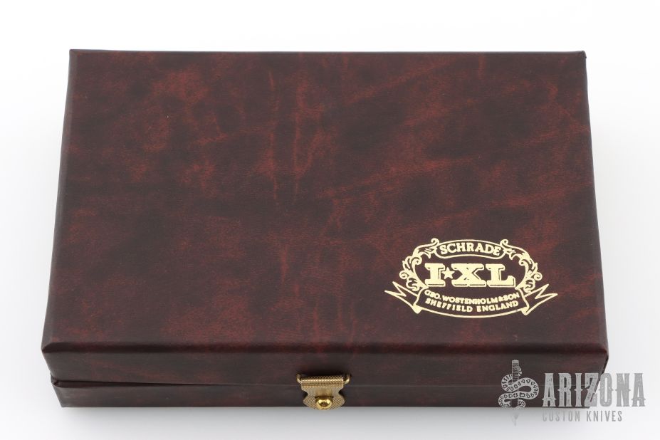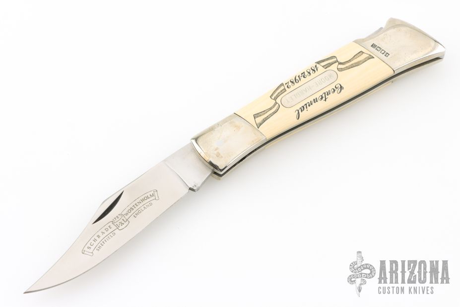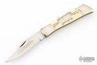 This Lockback by Schrade and George Wostenholm features a satin finished blade with nail nick. The handle has nickel silver bolsters with integral liners, ivory paper micarta covers, steel backspacer. "012" on the bolster. Has some hallmarks on the frame "S W -- 1", i'm not sure what the third stamp is. The handle has been scrimshawed. Comes with original box, sheath and papers. Excellent condition.