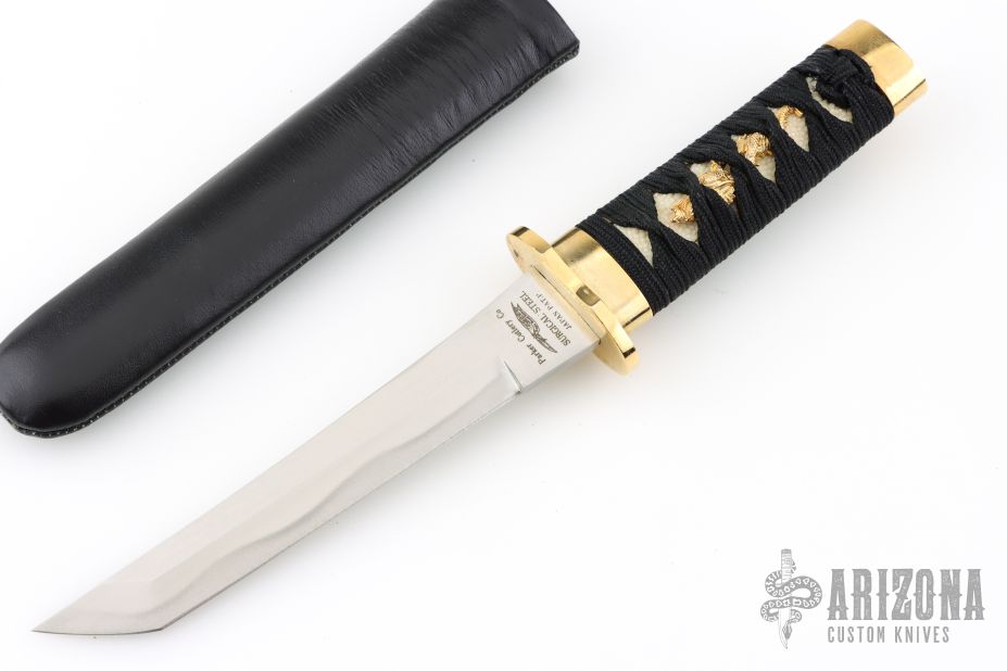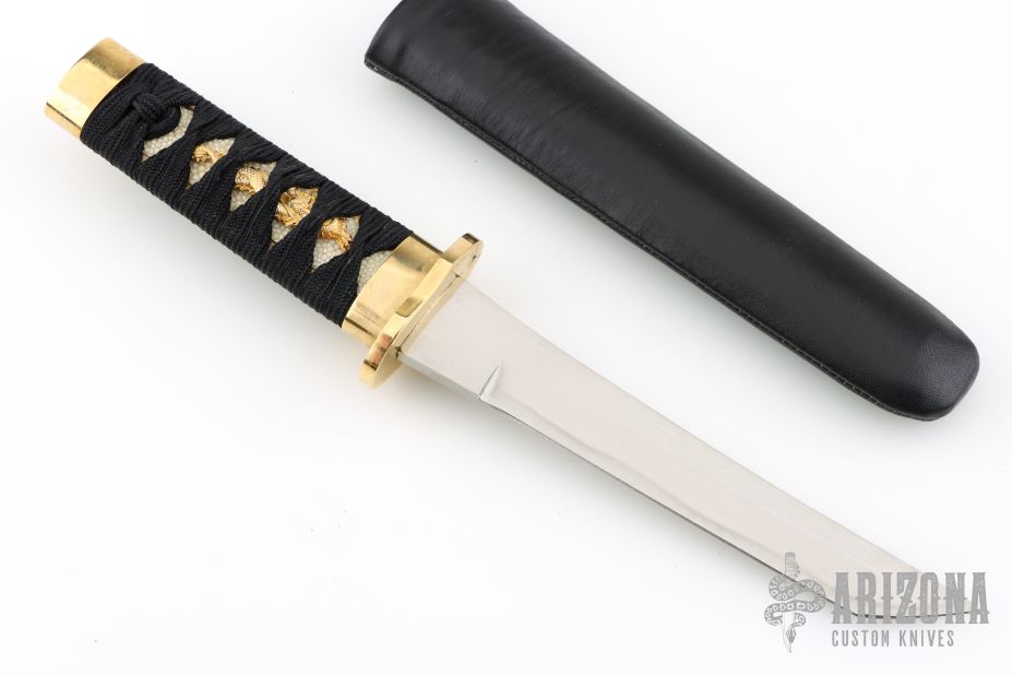 This Tanto by Parker Cutlery features a tanto blade with .194" blade stock and 1" blade depth, hidden tang construction. The handle has a brass tsuba, and brass seppa, has a black wrapped tsuka with white stingray skin and brass menuki, brass kashira. The Saya is leather coated wood. Comes in original box with COA. Nice vintage production. Excellent condition.
