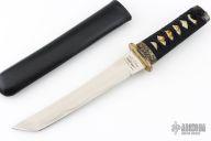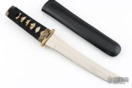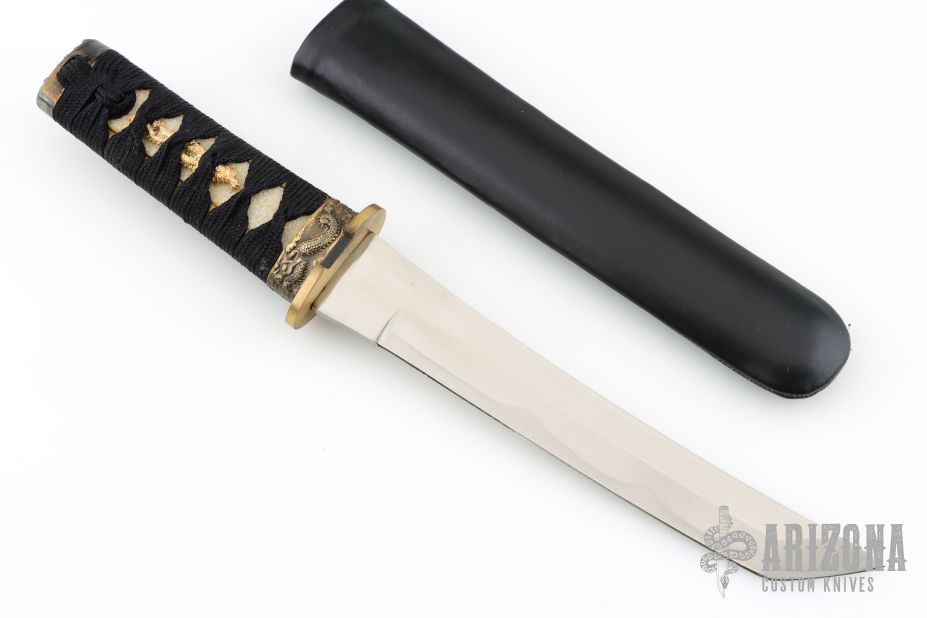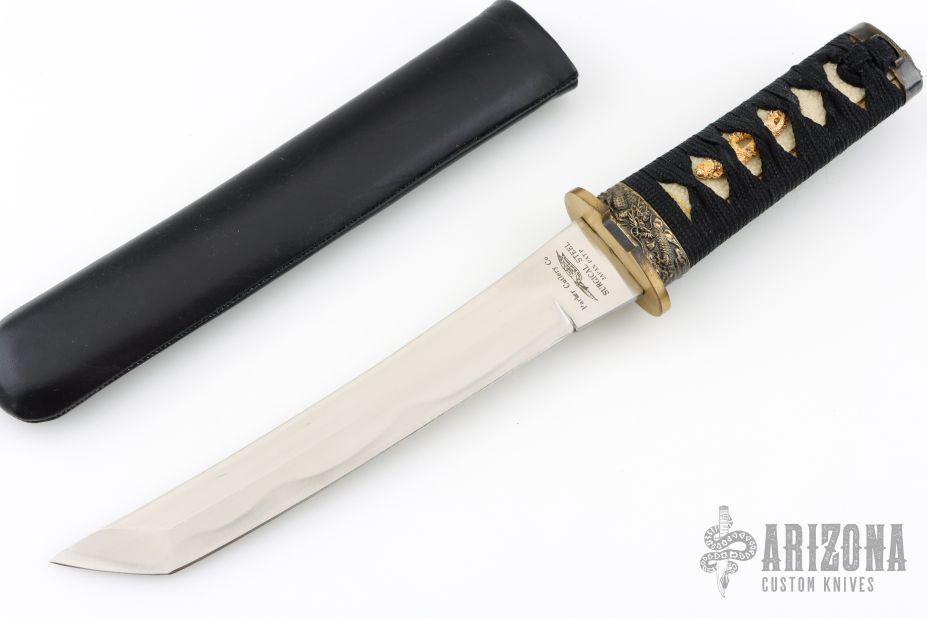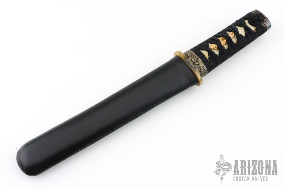 This Tanto by Parker Cutlery features a tanto blade with .192" blade stock and 1.347" blade depth, hidden tang construction. The handle has an antiqued brass tsuba, and antiqued dragon brass seppa, has a black wrapped tsuka with white stingray skin and brass menuki, antiqued dragon brass kashira. The Saya is leather coated wood (slight crack in the wood at the mouth of the sheath). Comes in original box with COA. Nice vintage production. Excellent condition.