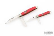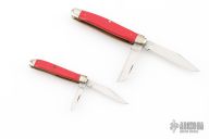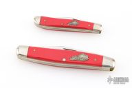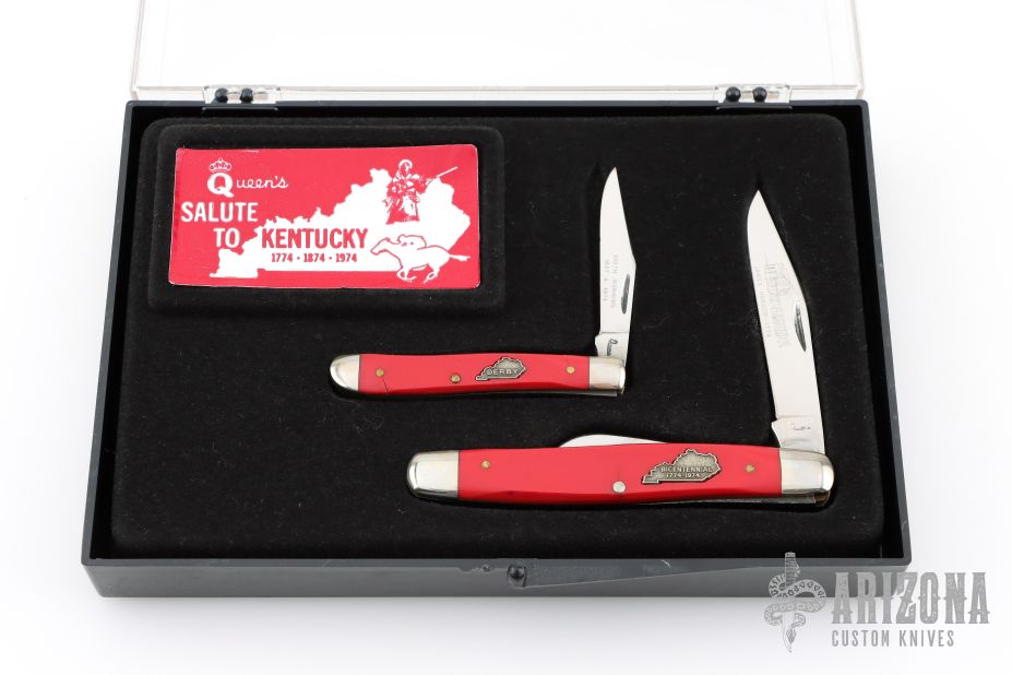 This knife set by Queen features two polished blades with nail nicks and long pull. The handle has nickel silver bolsters with saw cut red Delrin scales over brass liners and stainless steel backspacer. Serial #006123. Comes with original box. Has a few light scratches, excellent condition otherwise.