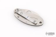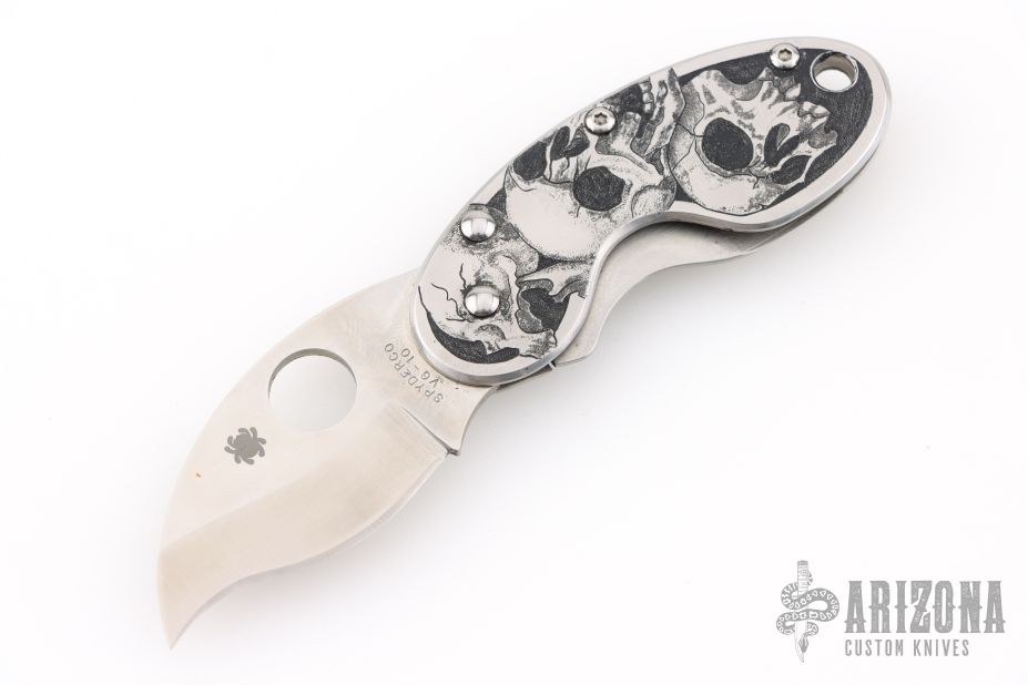 The Spyderco Cricket features a satin finished blade with thumbhole.  Satin finished steel frame with a tip down pocket clip.  Includes the original box. Has a few light scratches, otherwise excellent condition. Has skull engraving done by Fray & Son N.