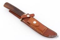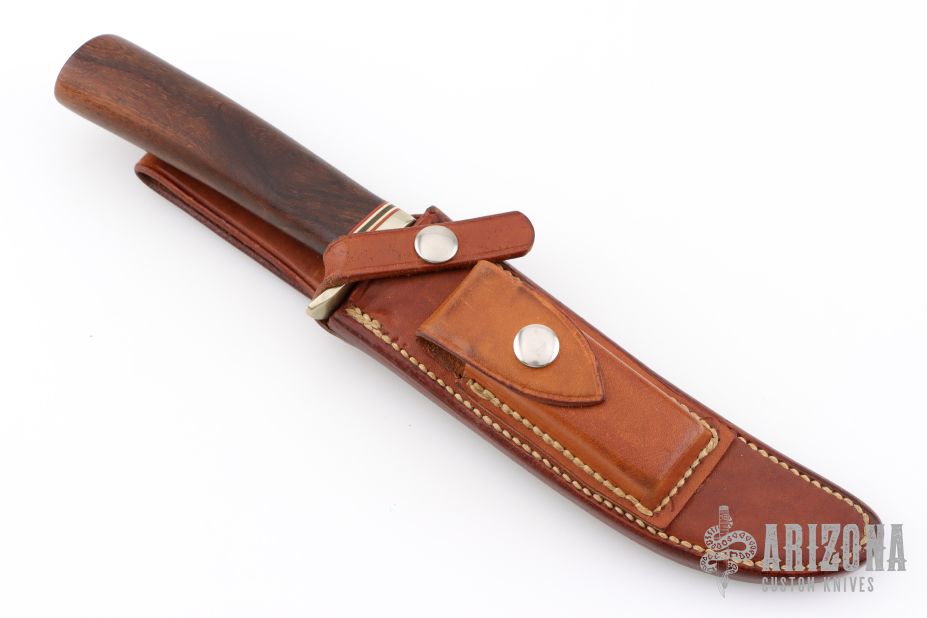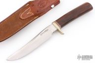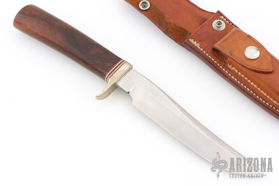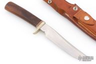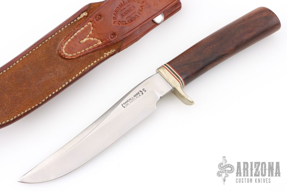 This Model 3-6 by Randall Made Knives features a satin finished blade with false top edge, .230" blade stock and 1.118" blade depth, hidden tang construction. The handle has a brass guard, desert ironwood grip with a compass in the butt and red/white/blue spacers. Comes with a brown leather sheath and sharpening stone. Has a few light scratches, otherwise excellent condition.