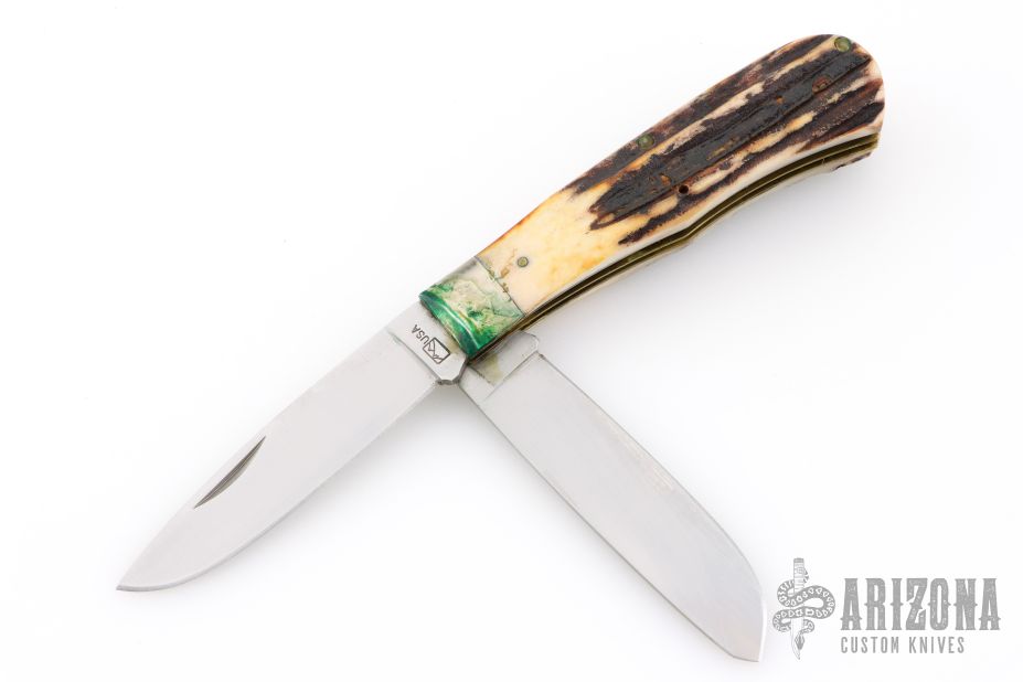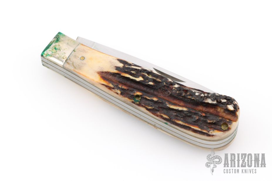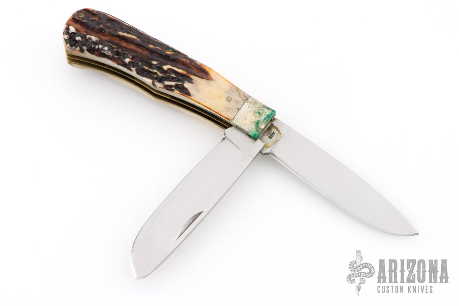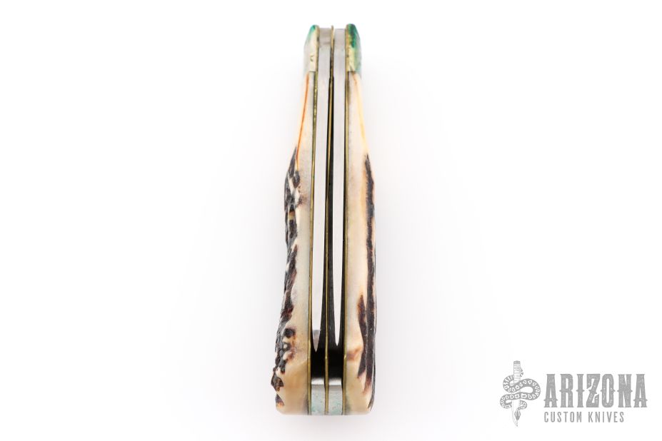This A05 Slipjoint by Alcas features satin finished blades with nail nicks. The handle has nickel silver bolsters, stag scales, brass liners and stainless steel springs. Comes with original box and leather belt sheath. Has some patina, light scratches and verdigris. Great condition otherwise.