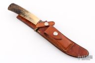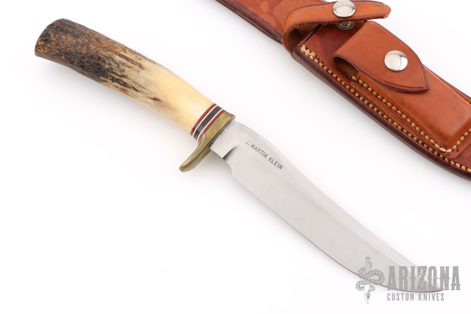 This model 3-6 from Randall Made Knives has an upswept satin finish blade with false top edge, .212" blade stock and 1.135" blade depth, hidden tang construction. The handle is comprised of a brass guard with red, white and blue (7) spacers and a stag grip. Includes rough back brown leather sheath with baby dot buttons. Comes with zippered case. Excellent condition. "J. Martin Klein" on the back of the blade.