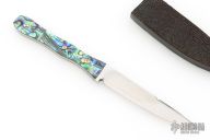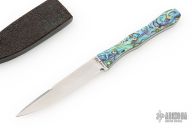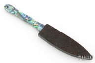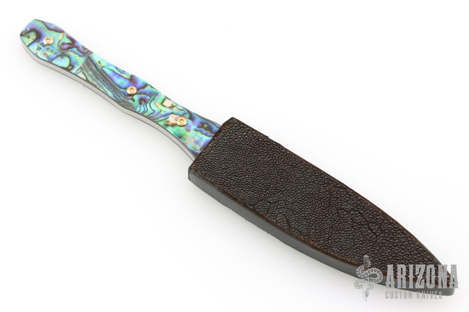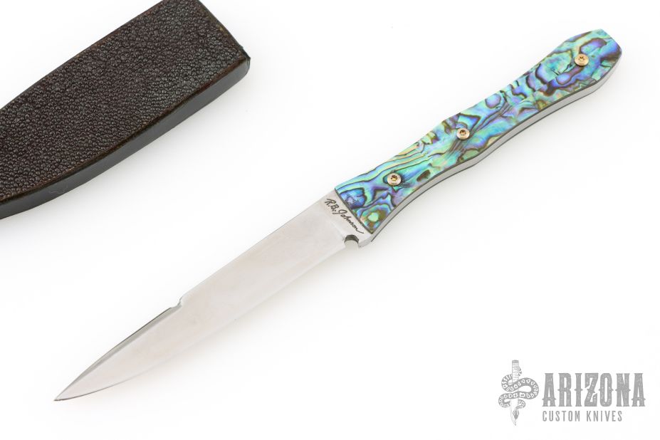 This knife by RB Johnson features a San Mai blade with sharpened top edge, .116" blade stock and .530" blade depth, full tang construction. The handle has abalone scales. Comes with a stingray skin sheath and original box. Excellent condition.