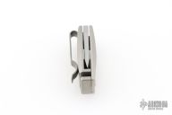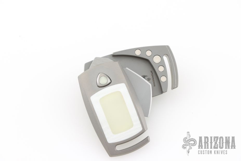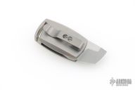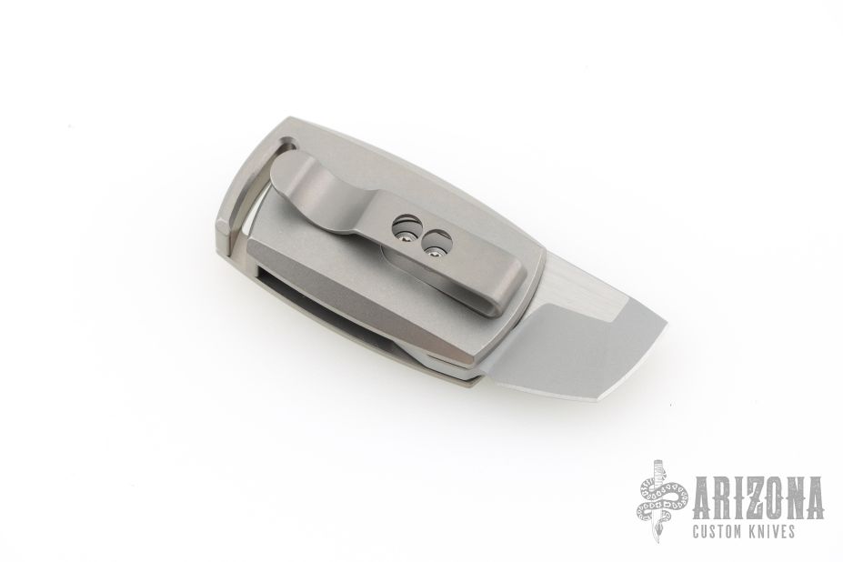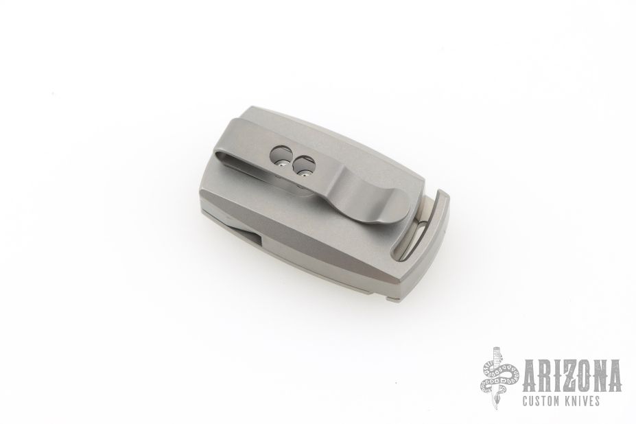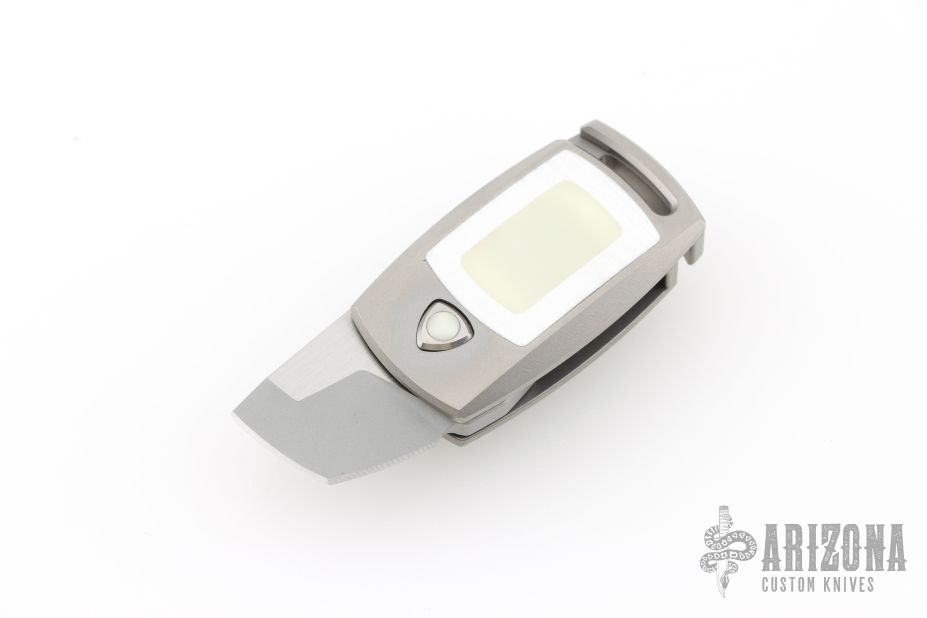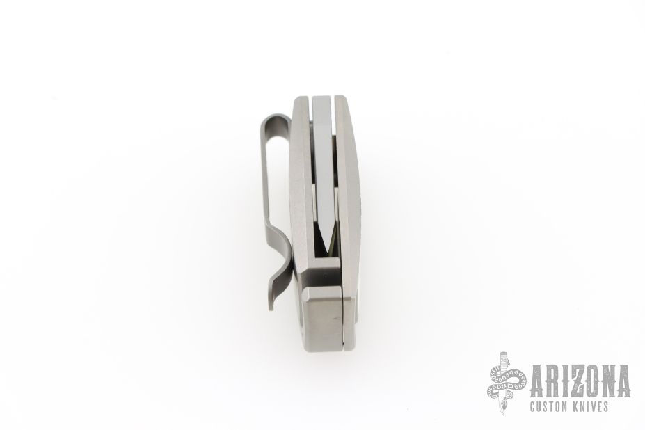 The handle is precision-machined from titanium, offering lightweight strength in a sleek silhouette. It features a removable pocket clip, and for those who prefer clipless carry, a matching filler tab is included. A glow-in-the-dark inlay in the pivot area on the front side adds functional flair—easy to find in low light, hard to ignore in any setting.