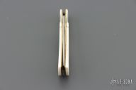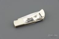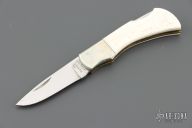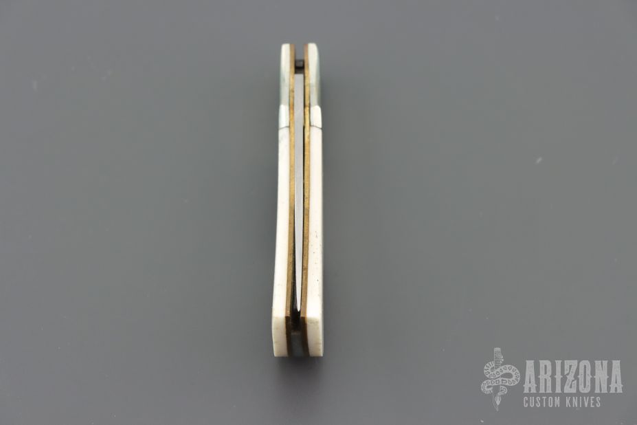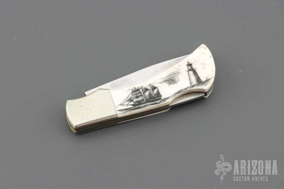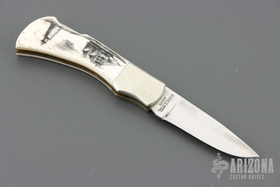 This lockback by Parker Cutlery Company has a mirror finished blade with nail nick. The handle has nickel silver bolsters, scrimshaw finished bone scales, brass liners, stainless steel backspacer. Has some light scratches, otherwise excellent condition.