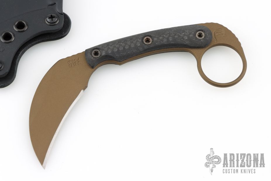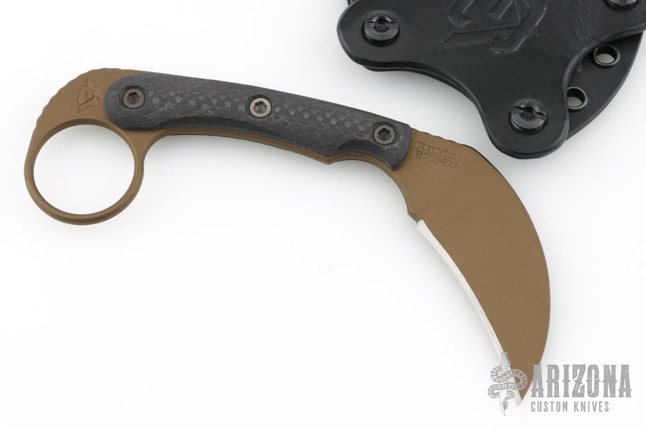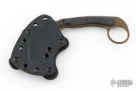 The Korbin is an easy to conceal defensive fixed blade knife. Karambit style knives like the Korbin are great back up blades for those that carry a handgun daily. They are lightweight, deploy quickly and haveno moving parts to fail. They are gross motor skill tools as well, meaning no special skill is required for effective use. The aggressively shaped talon blade on the Korbin is made from 3V steel and features a Burnt Bronze Cerakote finish for wear and glare resistance. The Korbin is designed to work in both reverse and standard grips, and the 1 1/8" finger hole is large enough to fit most finger sizes. The Korbin comes with a molded kydex sheath that includes a two-way belt adapter allowing ambidextrous, vertical and horizontal carry options. The sheath is also compatible with our optional MAD Straps if you would like to carry IWB (Inside Waist Band). You can find the optional MAD Straps on RMJ's website.