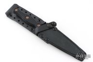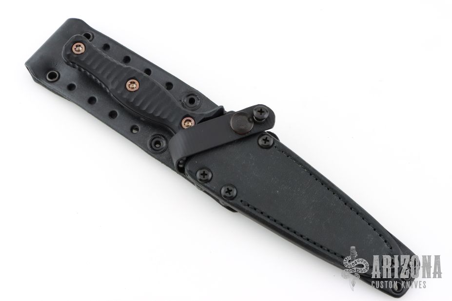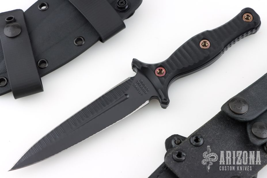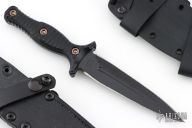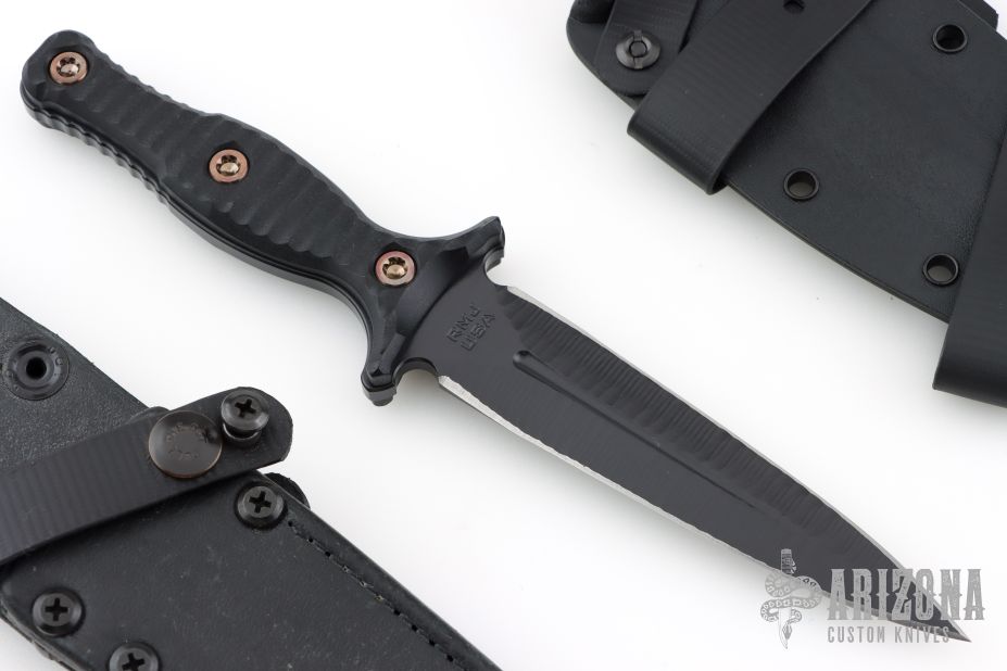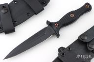 This Raider Dagger by RMJ Tactical features a textured and black cerakoted double edged blade with fullers, .218" blade stock and 1.154" blade depth, full tang construction. The handle has black G-10 scales with hollow flanged pins, notched on tang of blade. Comes with original box, papers and kydex sheath. Also comes with a black leather sheath by Chattanooga Leatherworks. Excellent condition.