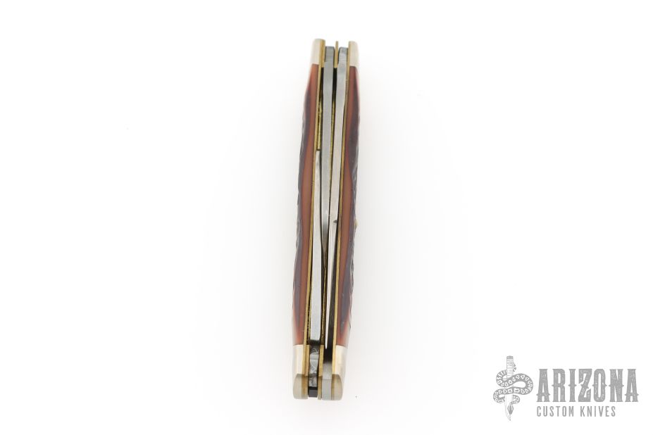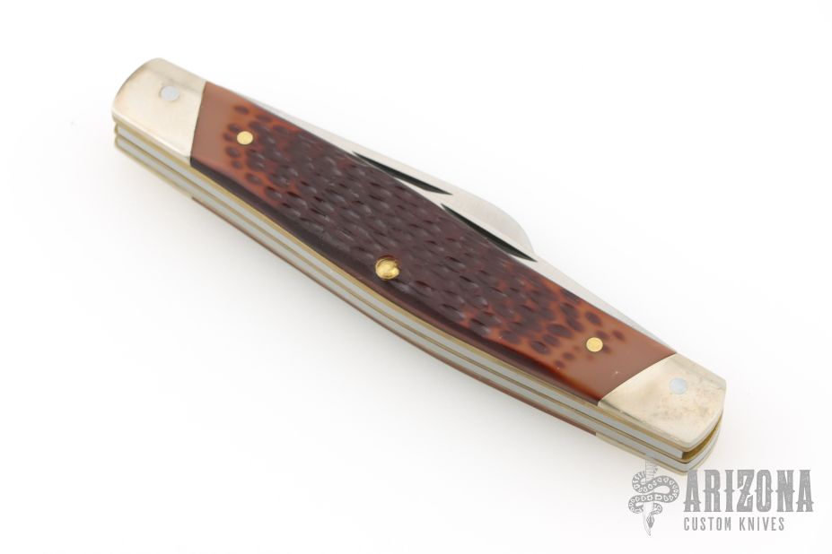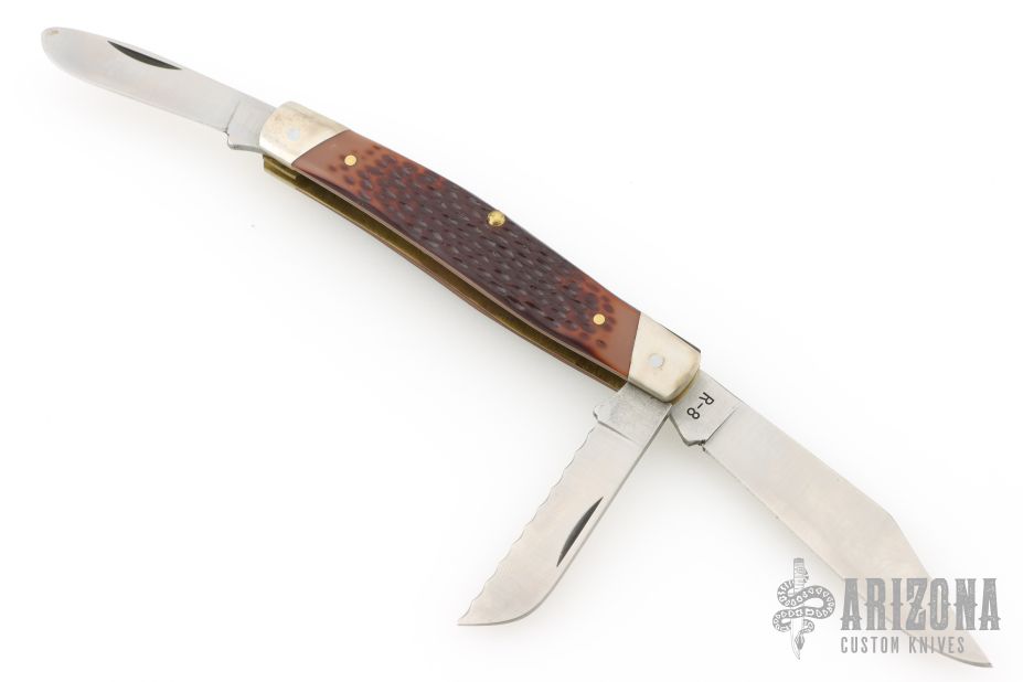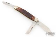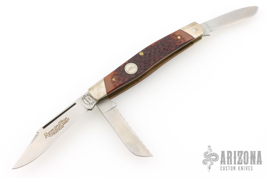 This 3-Blade Stockman from Remington has three satin finished blades with nail nicks. The handle has nickel silver bolsters, faux jigged bone covers, brass liners and steel springs. Comes with original box and papers. Excellent condition.