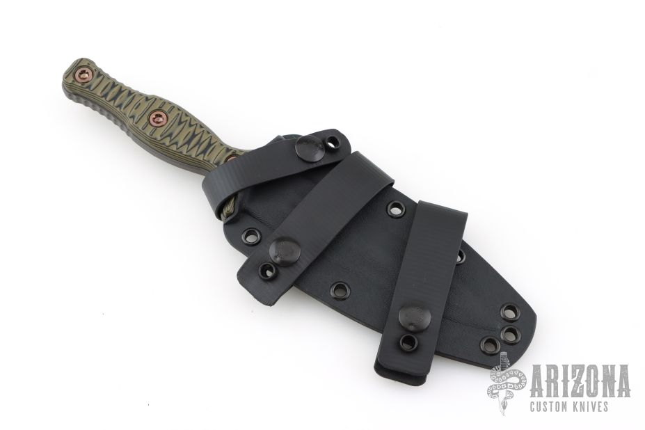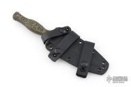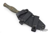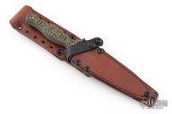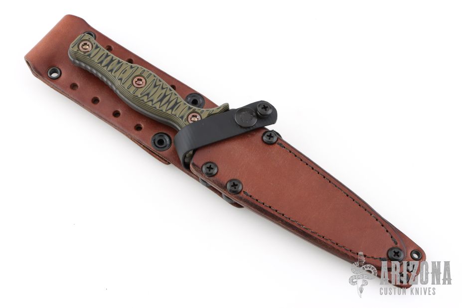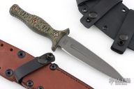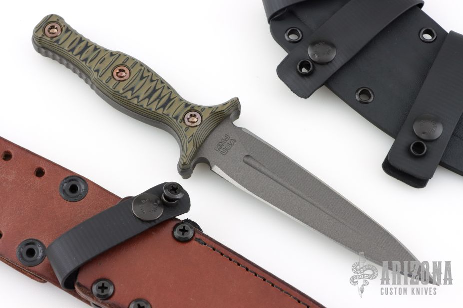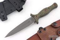 This Raider Dagger by RMJ Tactical features a tungsten cerakoted double edged blade with fullers, .218" blade stock and 1.154" blade depth, full tang construction. The handle has dirty olive G-10 scales with anodized screws, notched on tang of blade. Comes with original box, papers and kydex sheath. Also comes with a brown leather sheath by Chattanooga Leatherworks. Excellent condition.