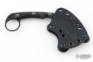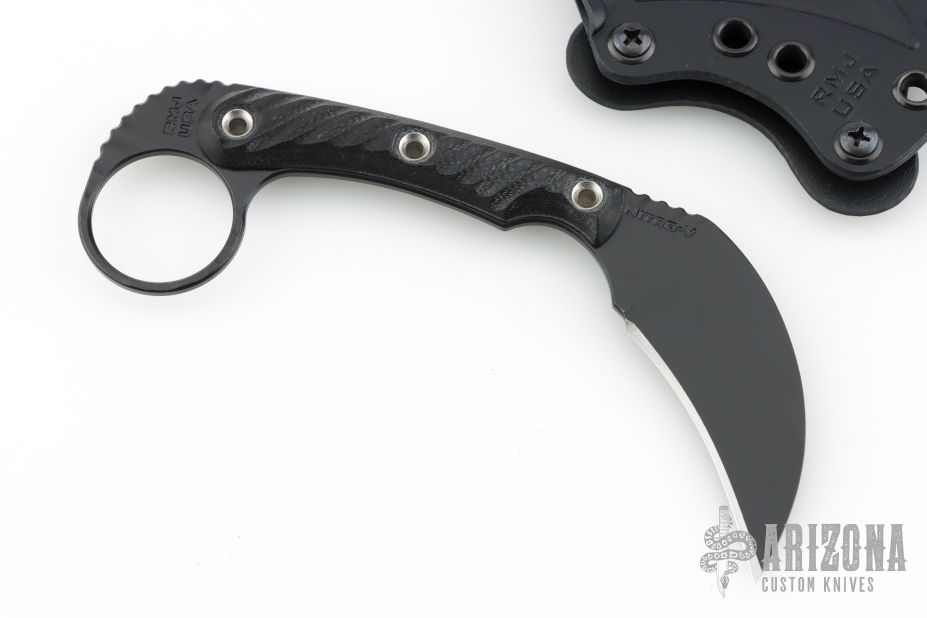 The Korbin is an easy to conceal defensive fixed blade knife. Karambit style knives like the Korbin are great back up blades for those that carry a handgun daily. They are lightweight, deploy quickly and haveno moving parts to fail. They are gross motor skill tools as well, meaning no special skill is required for effective use. The aggressively shaped talon blade on the Korbin is made from Nitro-V stainless steel and features a Tungsten Cerakote finish for wear and glare resistance. The Korbin is designed to work in both reverse and standard grips, and the 1 1/8" finger hole is large enough to fit most finger sizes. The Korbin comes with a molded kydex sheath that includes a two-way belt adapter allowing ambidextrous, vertical and horizontal carry options. The sheath is also compatible with our optional MAD Straps if you would like to carry IWB (Inside Waist Band). You can find the optional MAD Straps on RMJ's website.