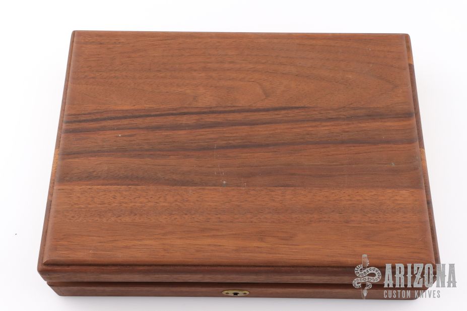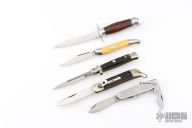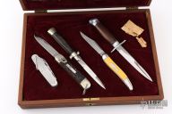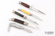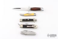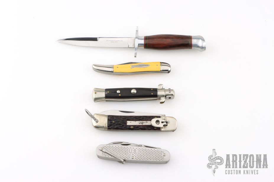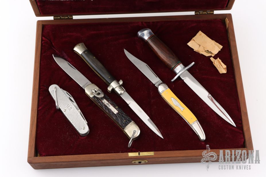 This 80's knife collection contains Wilkinson Sword bayonet fixed blade, Imperial yellow handle fish knife, Mauro stilleto, Dorko Knife springer, and Camillus military 4-tool knife. Comes with a wooden display box. They have some patina, and scuffs, great condition otherwise.