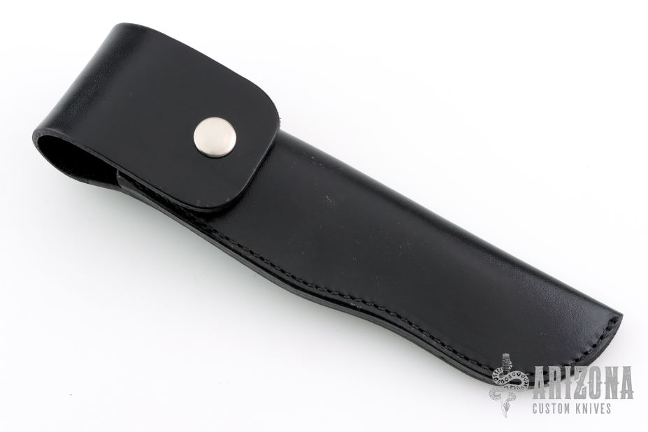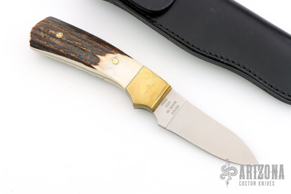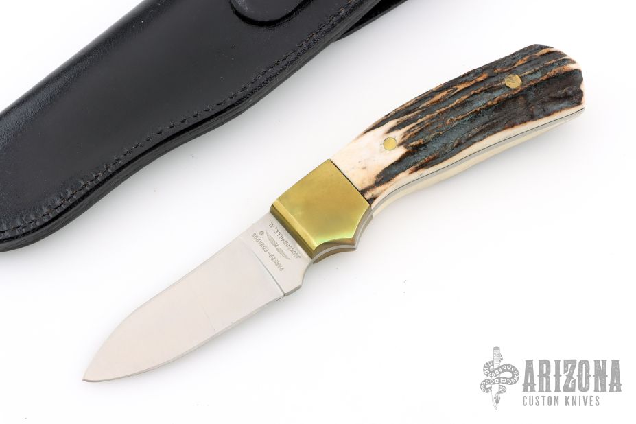 This knife by Parker-Edwards features a satin finished blade with .108" blade stock and 1.056" blade depth, full tang construction. The handle has pinned stag scales and brass bolsters. Comes with original box, and leather belt sheath. Excellent condition.