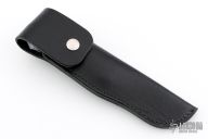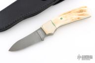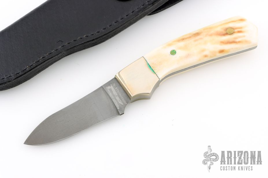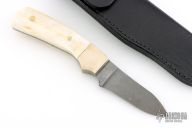 This knife by Parker-Edwards features a Damascus blade with .114" blade stock and 1.055" blade depth, full tang construction. The handle has pinned bone scales and nickel silver bolsters. Comes with original box, and leather belt sheath. Has a few light scuffs and scratches. Excellent condition.