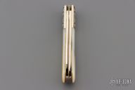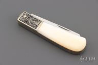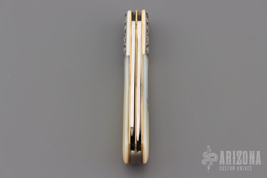 This slipjoint by Parker Cutlery Company features mirror finished blades with nail nicks. The handle has engraved nickel silver bolsters, pearl covers, abalone inlay, brass liners, steel springs. Has some light scratches, otherwise excellent condition. Comes with original box.