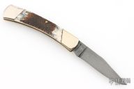 This lockback from Parker-Edwards features a rough finish Damascus clip point blade with nail nick. The handle is comprised of nickel silver caps and bolsters with jig bone covers over brass liners and steel spring. Comes in original box. Has some light scratches, excellent condition. "Damascus steel by custom maker Fain Edwards."