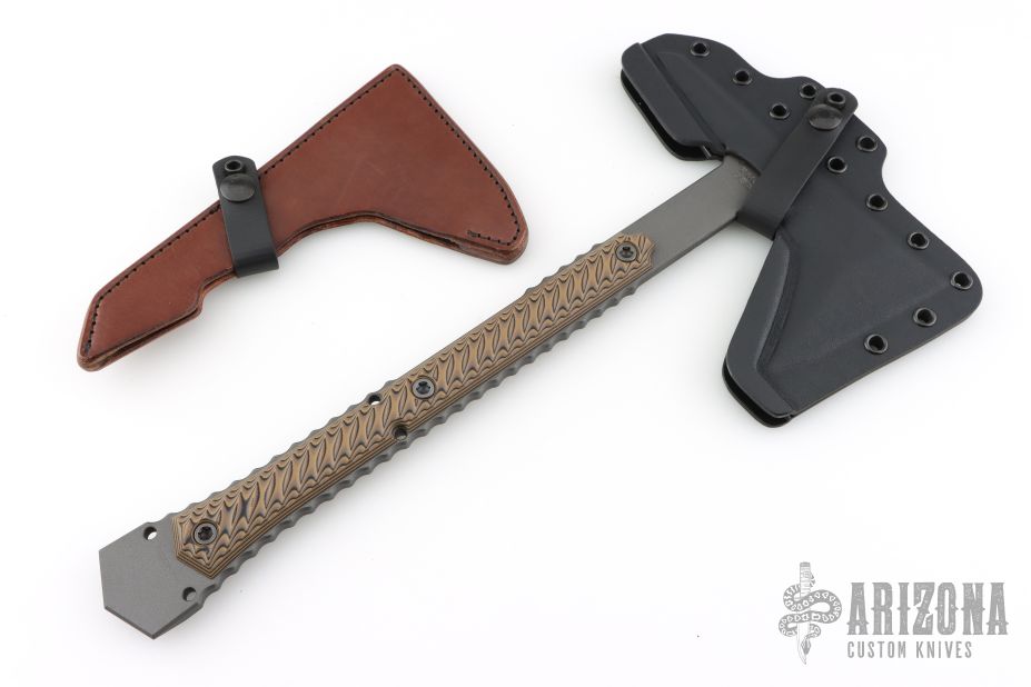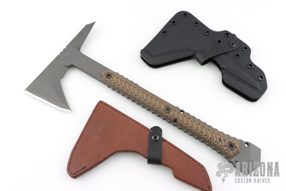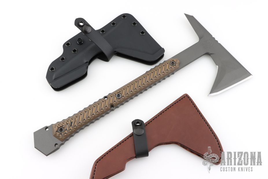 RMJ teamed up with Bawidamann Blades in 2012 to create a lightweight tomahawk that is fast in the hand and different than other tomahawks; thus the Ragnarok was born. Now after several years of making the Ragnarok for Bawidamann Blades, RMJ is now offering a production version. The RMJ Ragnarok is the same tomahawk with angled and textured G10 handles, as well as a Tungsten Gray Cerakote Finish.