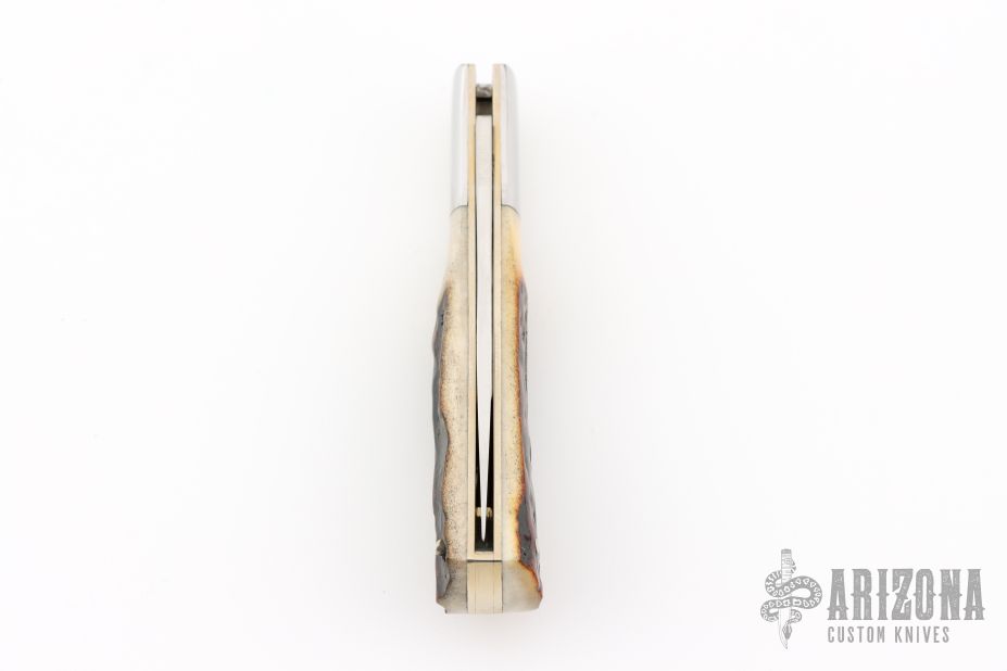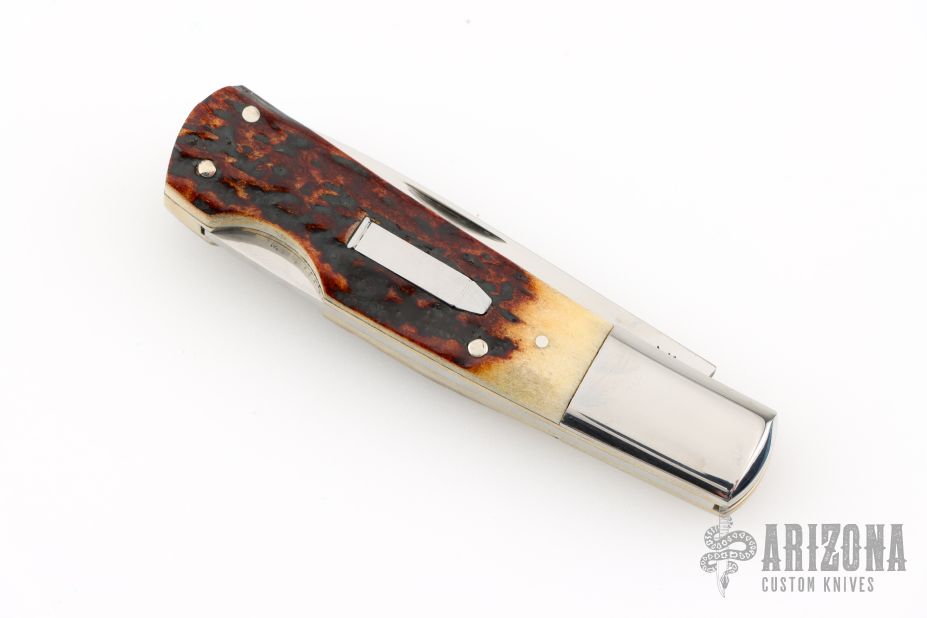 This Lockback by AG Russell features a mirror polished blade with nail nick. The handle has polished steel bolsters, stag scales, steel spring, and nickel silver liners.  Includes the original box.  Has some light scratches, otherwise Excellent Condition.