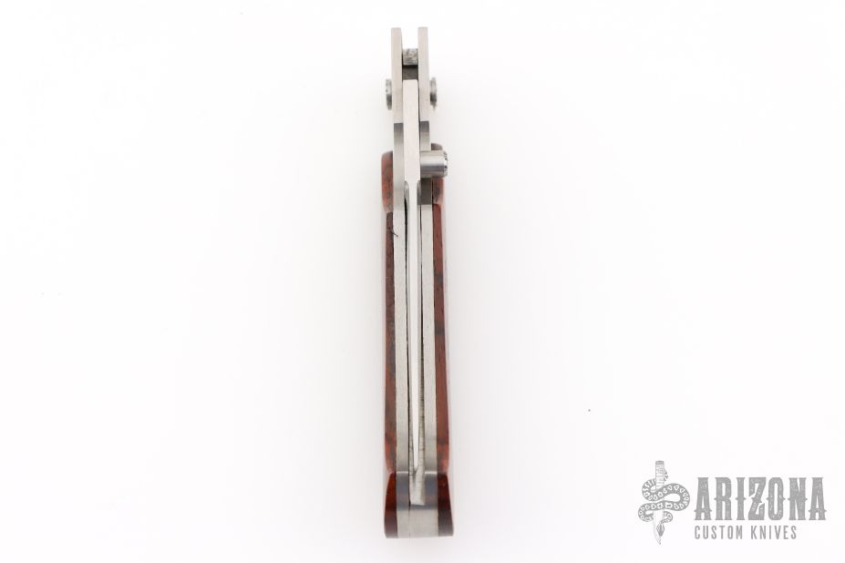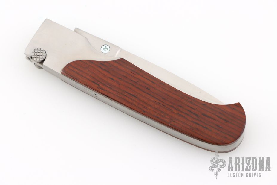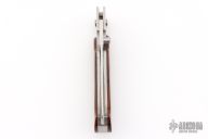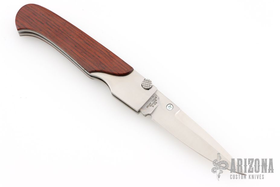 This Toggle Lock folder by Rigid features a satin finished bayonet blade with a single thumbstud. The handle has a stainless steel frame with wood overlays, a stainless steel backspacer. Comes with original box. Has a couple scratches, otherwise excellent condition.
