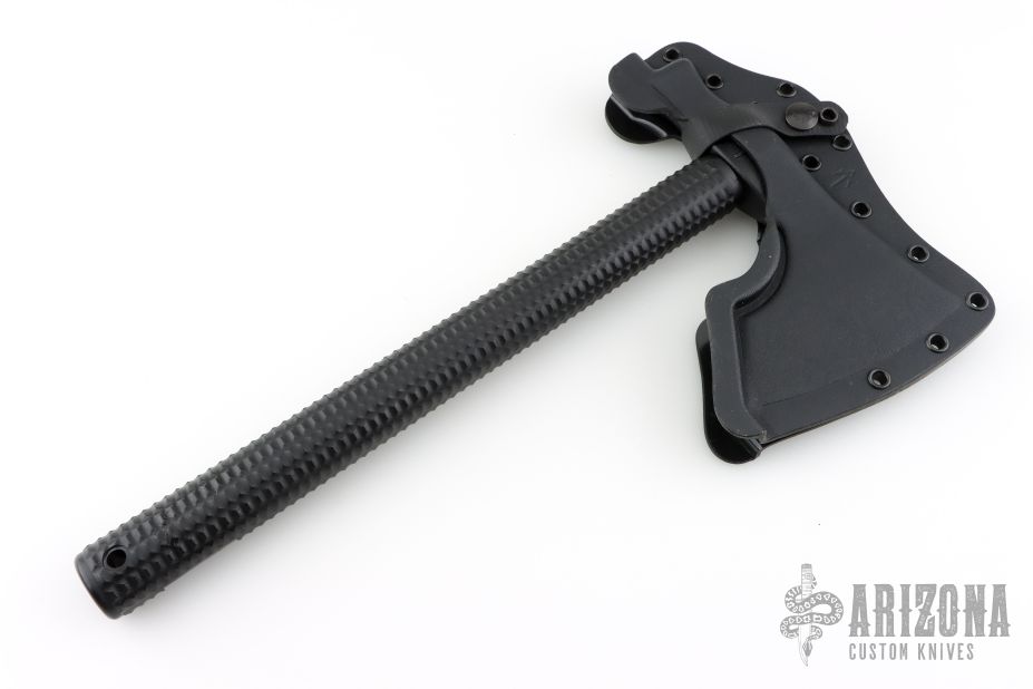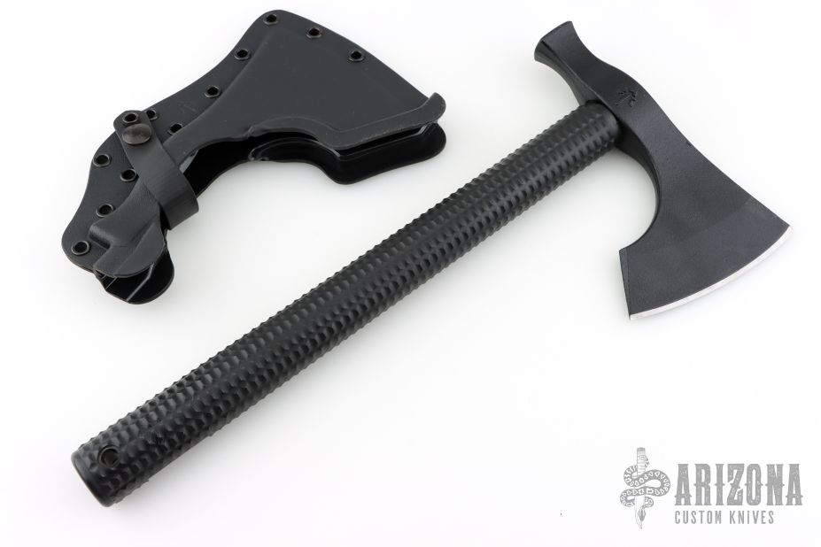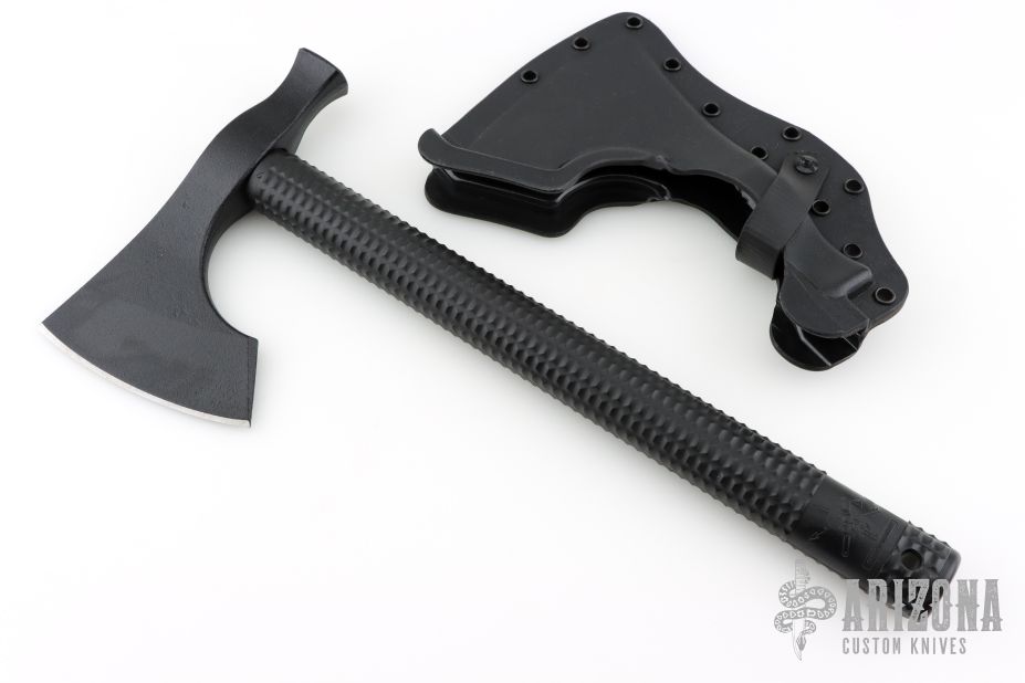 The Model 2 is a robust hammer poll tomahawk with an aggressive 4.125" cutting edge. Combine that with a straight handle makes it a well balanced tool that offers incredible cutting capability. In addition to the sharpened main edge, the Model 2 has a true hammer at the back of the head making it a great companion around camp. The bearded design allows for a high grip, facilitating more accurate fine motor skill work. The Model 2 features a black powdercoat finish for corrosion and wear resistance. Included is a bottom-eject, molded kydex sheath and low-ride M.O.C. straps for belt carry.