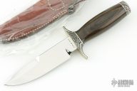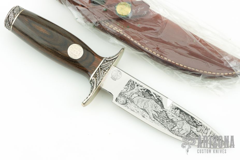 This Collectors Series Limited Edition knife by Smith and Wesson has the serial number of 0093. The blade features a polished and engraved graphic. .247" Blade Stock. 1.323" Blade Depth. The handle is comprised of a sterling silver guard and pommel with dymondwood handle over hidden tang construction. Sterling Silver inlay marked "Collectors Series 0093" on "B" side of handle. Includes the original box, sheath, and papers. Excellent condition.