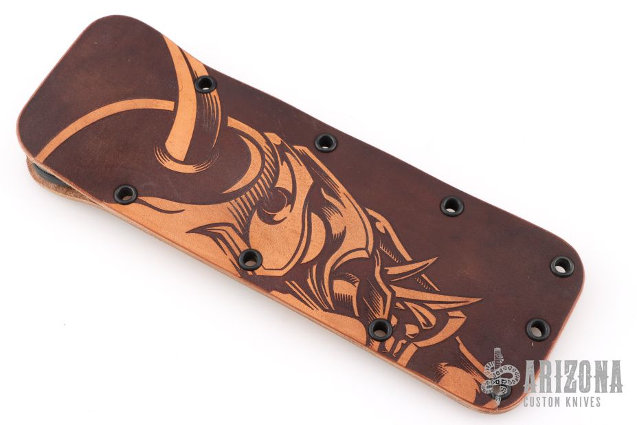 Each Akuto includes a leather case adorned with Oni Mask art, kydex sheath, 3V Syndicate leather patch and coin, along with a membership to the 3V Syndicate.