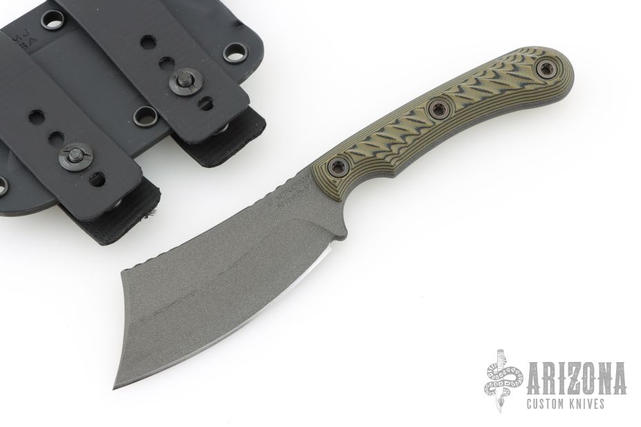 The Jackdaw is a cleaver style EDC blade that's right at home in the woods or an urban environment. The blade has a Tungsten Cerakote finish for corrosion and glare resistance. The beveled and contoured G10 grips feature diagonal texturing for a not too aggressive, but still secure grip. The Jackdaw comes with a molded kydex scabbard with two MAD straps that allow for scout-style carry (horizontal) and inside the waistband (IWB) vertical carry. It is also MOLLE compatible and can be set up to attach to PALS webbing on any pack, plate carrier, or similarly equipped gear.