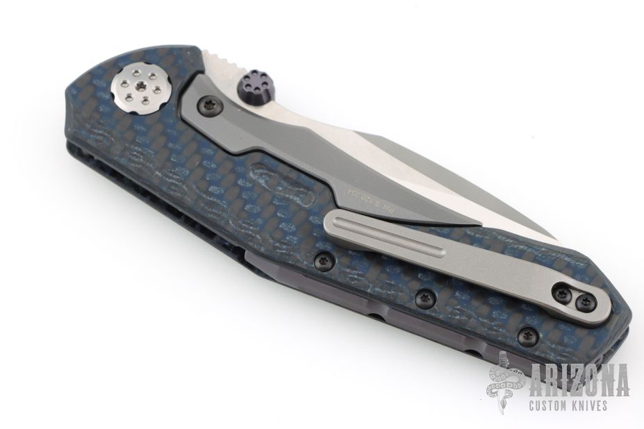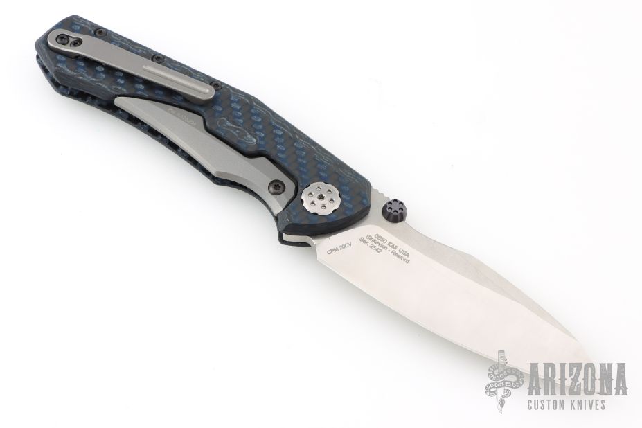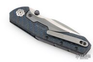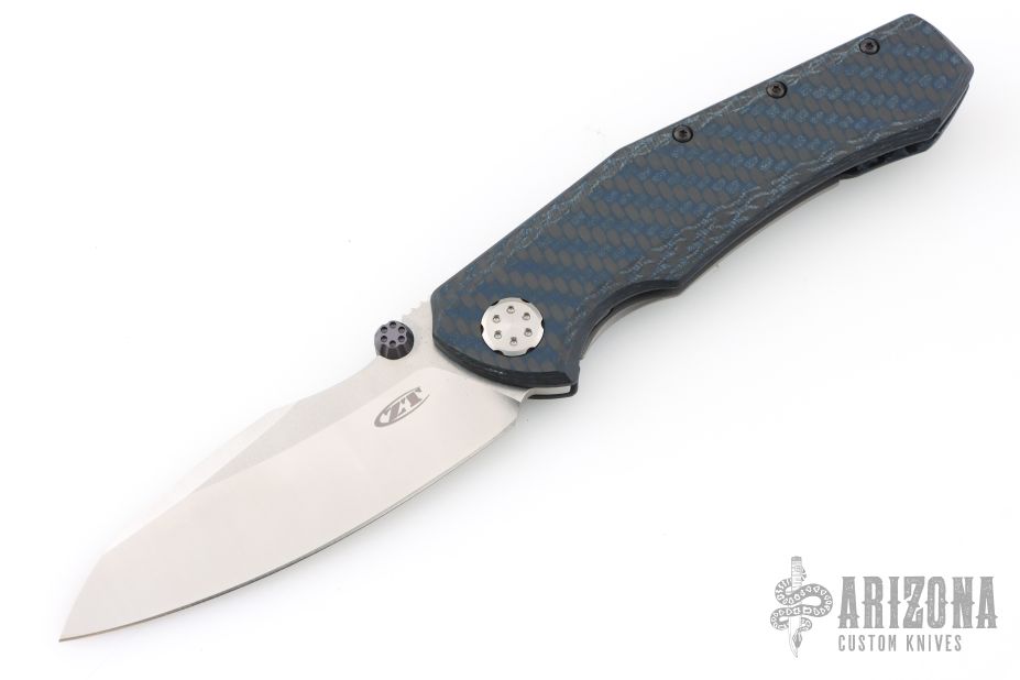 This knife by Zero Tolerance is a Sinkevich/Rexford Design, it features a two-tone CPM 20CV blade with tumbled flats and satin grinds, notched thumbrest and thumb lug. The handle has black/blue carbon fiber frame with a bead blasted titanium lockbar and tip up clip, bead blasted and darked titanium backspacer. S/N 2542. Comes in original box with papers. Excellent Condition.