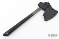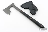 The Raven design comes from our talented blacksmith, Reid Carmack who has been making custom forged Raven's for years.  Like so many of our products, the Raven's inspiration comes from tradition, in this case, 9th century Nordic axes.  In addition to the aggressive and distinctive looks, the raven is a formidable and functional tool. It features a robust head with a 3.5" cutting edge, the head flows into a straight handle that creates an extremely well balanced tool with incredible cutting capability.  The bearded design allows for a high grip for accurate fine motor skill work. The 3D contoured G10 handles incorporate a diagonal, grooved texture for a sure grip without being overly aggressive.  The Raven features a Tungsten Cerakote finish that offers corrosion resistance and a low-vis look. Included is a molded, bottom-eject kydex sheath and low-ride M.O.C. straps.