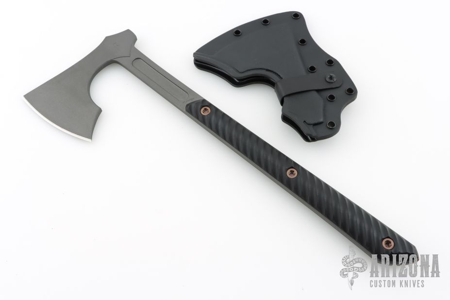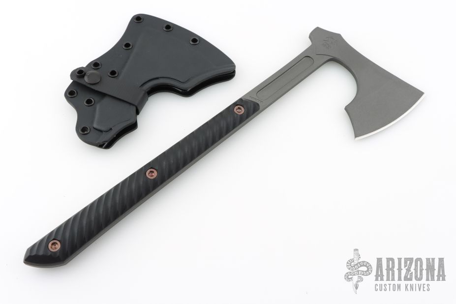 The Raven design comes from our talented blacksmith, Reid Carmack who has been making custom forged Raven's for years.  Like so many of our products, the Raven's inspiration comes from tradition, in this case, 9th century Nordic axes.  In addition to the aggressive and distinctive looks, the raven is a formidable and functional tool. It features a robust head with a 3.5" cutting edge, the head flows into a straight handle that creates an extremely well balanced tool with incredible cutting capability.  The bearded design allows for a high grip for accurate fine motor skill work. The 3D contoured G10 handles incorporate a diagonal, grooved texture for a sure grip without being overly aggressive.  The Raven features a Tungsten Cerakote finish that offers corrosion resistance and a low-vis look. Included is a molded, bottom-eject kydex sheath and low-ride M.O.C. straps.