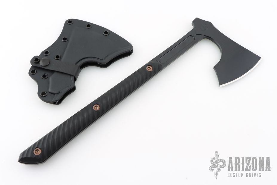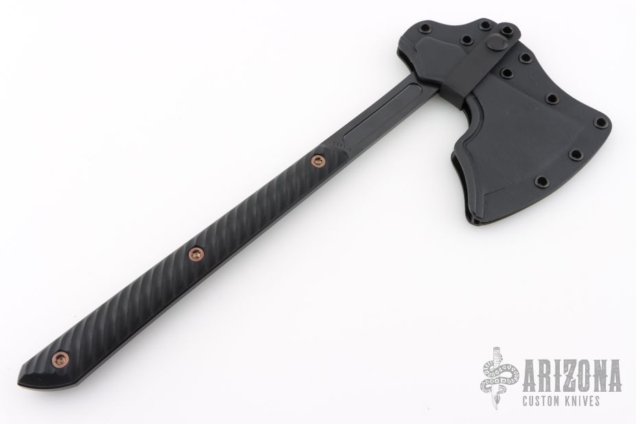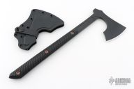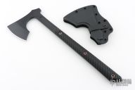 The Raven design comes from our talented blacksmith, Reid Carmack who has been making custom forged Raven's for years. Like so many of our products, the Raven's inspiration comes from tradition, in this case, 9th century Nordic axes. In addition to the aggressive and distinctive looks, the raven is a formidable and functional tool. It features a robust head with a 3.5" cutting edge, the head flows into a straight handle that creates an extremely well balanced tool with incredible cutting capability. The bearded design allows for a high grip for accurate fine motor skill work. The 3D contoured G10 handles incorporate a diagonal, grooved texture for a sure grip without being overly aggressive. The Raven features a Black Cerakote finish that offers corrosion resistance and a low-vis look. Included is a molded, bottom-eject kydex sheath and low-ride M.O.C. straps.