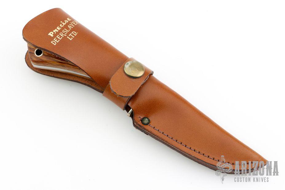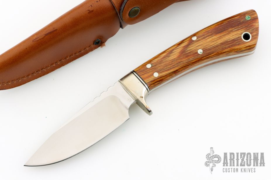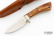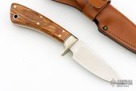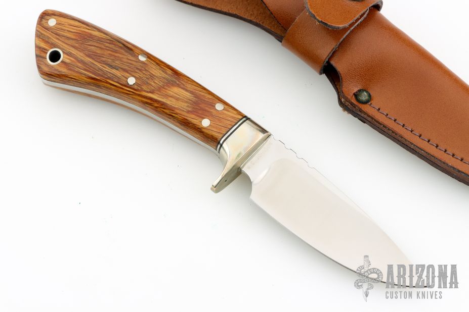 This knife by WC Johnson features a mirror polish drop point blade with .128" blade thickness and .989" blade depth. Notched thumbrest. Full tang construction. The handle has a nickel silver guard, black spacer, and pinned wood grip with lanyard hole. Great feel in the hand. Comes with a box and leather sheath. Has some light scratches, excellent condition. Numbered 126 in the ricasso.