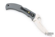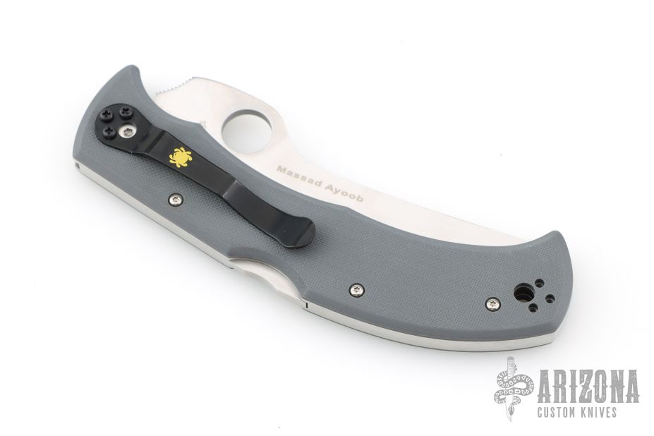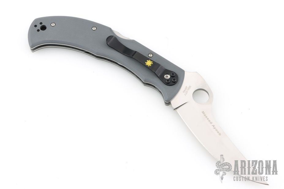 This Massad Ayoob by Spyderco features a satin finished blade with thumbhole and notched thumbrest. The handle has gray G-10 scales, stainless steel liners with a tip down reversible black stainless clip. Includes original box and papers. Excellent condition.