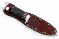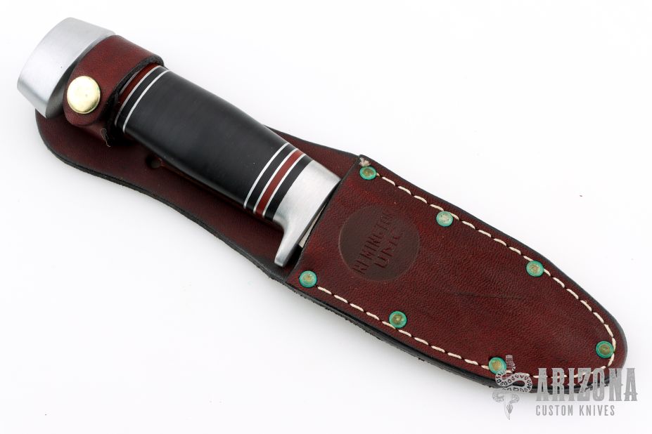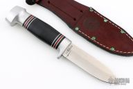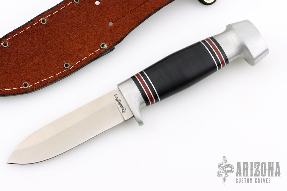 This knife by Remington features a satin finished drop point blade with a hidden tang construction.  .133" Blade Stock.  1.013" Blade Depth.  The handle features an aluminum guard and butt with a stacked black micarta grip.  Comes with original box, papers, and sheath. Excellent condition.