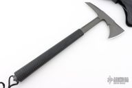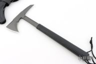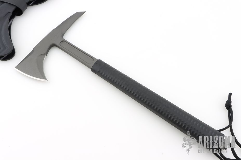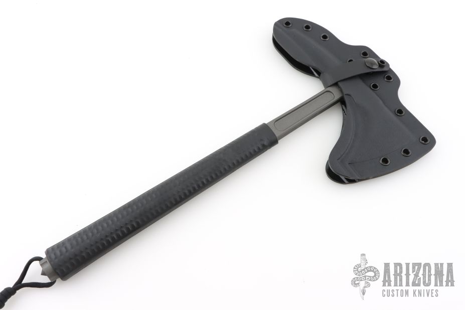 What sets the S13 apart from other tools is the rubber over-molded handle. The advantage of such a design is not only a great grip but vibration reduction and that fact that the handle is insulated. The S13 Shrike has been tested to provide insulation up to 2,000 volts. If the tool is being used to chop through a wall and happens to connect with a live electrical wire, a good degree of protection exists from getting electrocuted. The butt end of the grip features a cap that screws off to gain access to a small storage compartment. We do sell a sharpening file that fits the butt-cap, HERE The ax features a Tungsten Cerakote finish for corrosion and wear resistance and a low visibility look. Included is a molded, bottom-eject kydex sheath and low-ride M.O.C. straps.
