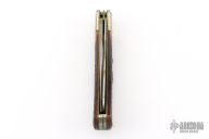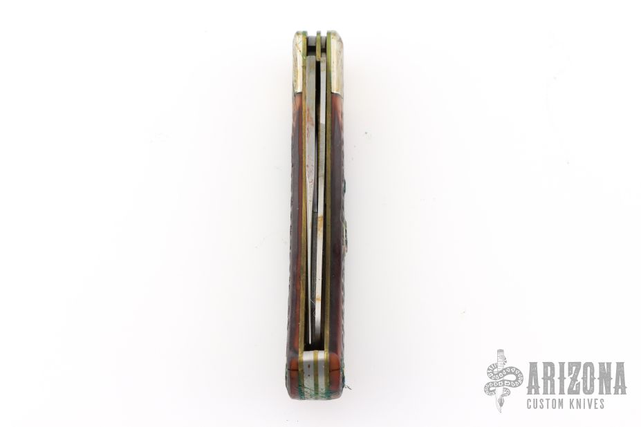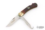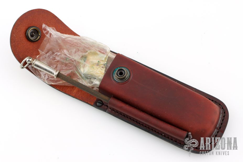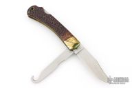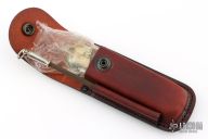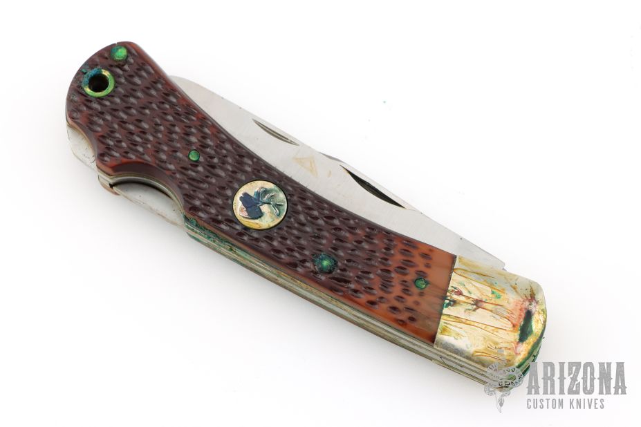 This lockback by Remmington has two satin finished blades with nail nicks. The handle has nickel silver bolsters, faux jigged bone covers, brass liners and steel springs. Comes with original box, papers, leather belt sheath. Has some patina, and verdigris. Needs to be cleaned. Great condition otherwise.