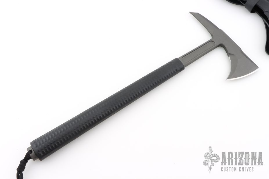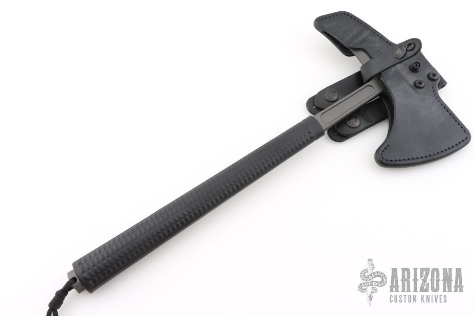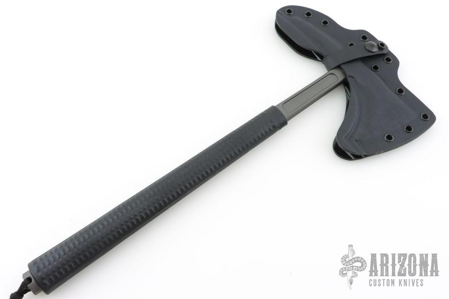 What sets the Shrike apart from other tools is the insulated rubber over-molded handle. The advantage of such a design is not only a great grip but vibration reduction and that fact that the handle is insulated. The Shrike has been tested to provide insulation up to 2,000 volts. If the tool is being used to chop through a wall and happens to connect with a live electrical wire, a good degree of protection exists from getting electrocuted. The butt end of the grip features a cap that screws off to gain access to a small storage compartment. We do sell a sharpening file that will fit the butt-cap, HERE The ax features a Tungsten Cerakote finish for corrosion and wear resistance and a low visibility look. Included is a molded, bottom-eject kydex sheath and low-ride M.O.C. straps.