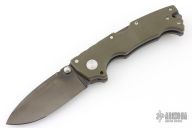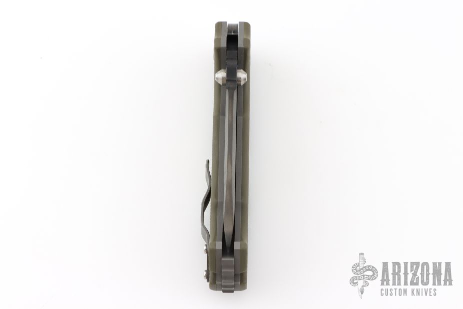 This AD-10 lockback by Andrew Demko features a DLC finished drop point blade with dual thumbstuds, .190" blade stock and 1.386" blade depth. The handle has G-10 scales, bead blasted titanium liners and matching tip up pocket clip. Very strong lockup, Tri-Ad lock.  Comes with a nylon zippered case.  Has a few light scuffs on the pocket clip otherwise the knife is in Excellent condition.