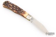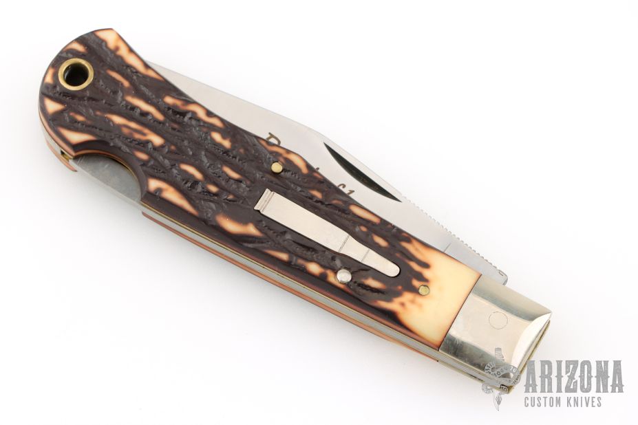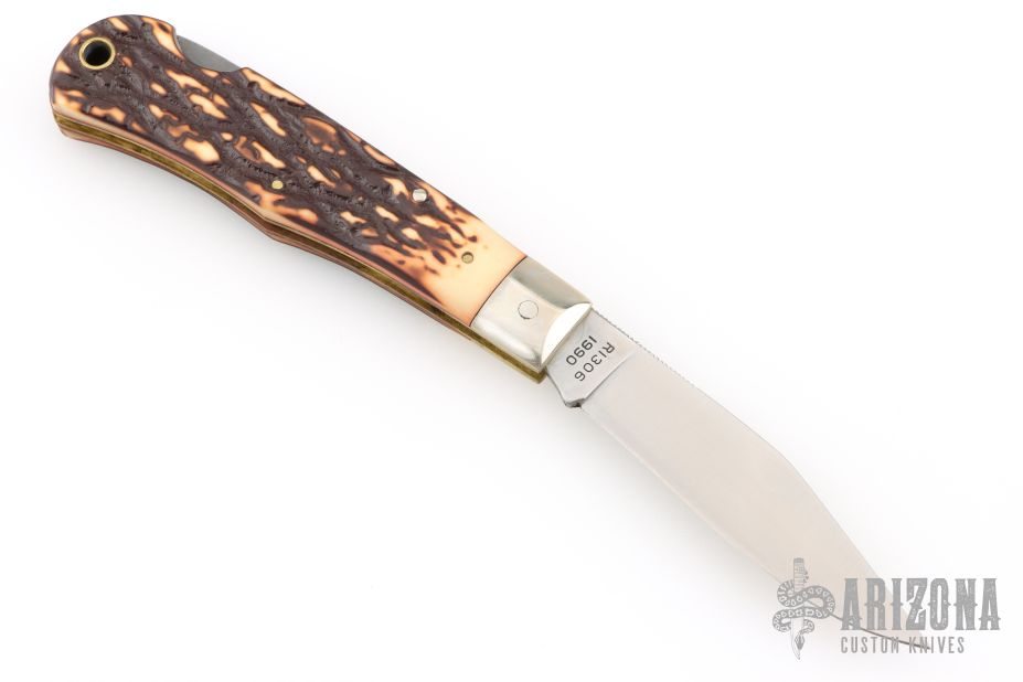 This "Tracker" bullet knife was the Remington Collector's Series Knife for 1990.This knife features a satin finished blade with a notched thumbrest and a single nail nick.  The handle has nickel silver bolsters, faux stag scales, brass liners and a stainless steel backspring.  Includes the original box and papers.  Excellent Condition.