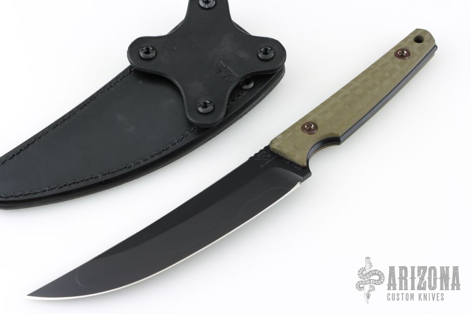 The Musashi comes with a classic style Chattanooga Leatherworks scabbard with frog in Monkey Edge signature black with contrasting red stitching.