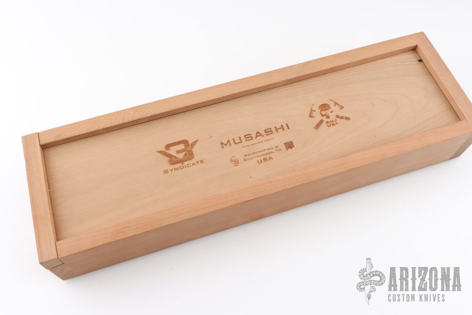 Each comes in a wood storage box made from cherry, and included with each Musashi is a sealed introduction letter to the 3V Syndicate complete with coin and patch.”
