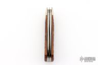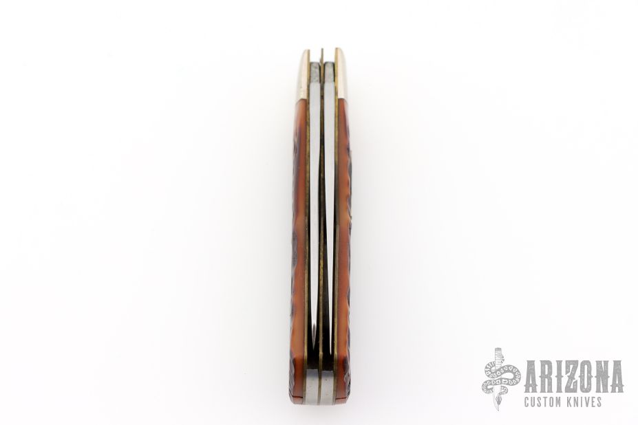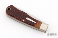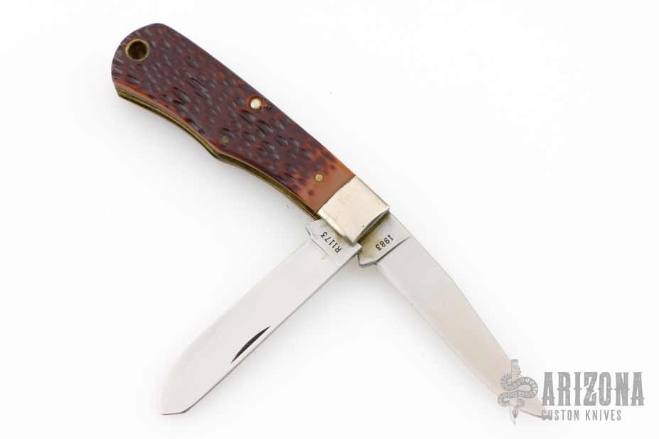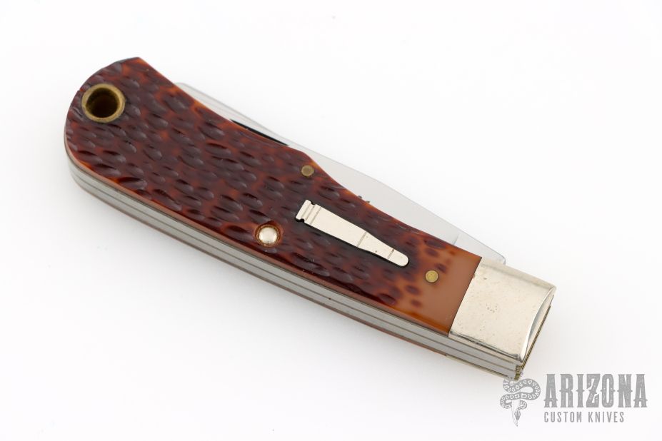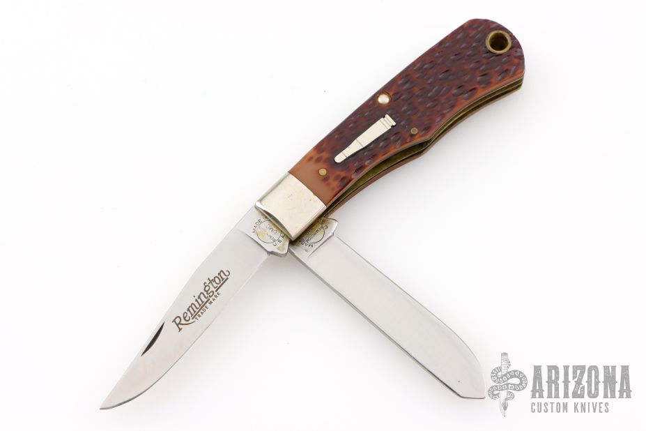 This Bullet Knife by Remmington has two satin finished blades with nail nicks. The handle has nickel silver bolsters, jigged bone covers, brass liners and steel springs.  Has some patina and light scratches. Excellent Condition. Comes with original box and papers.