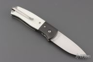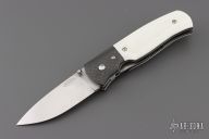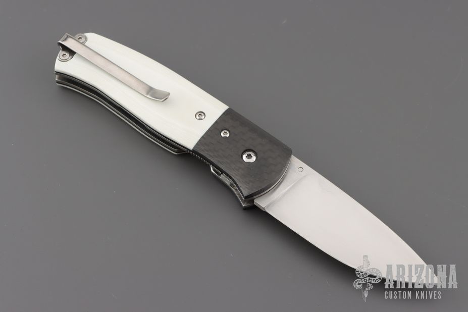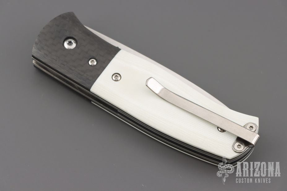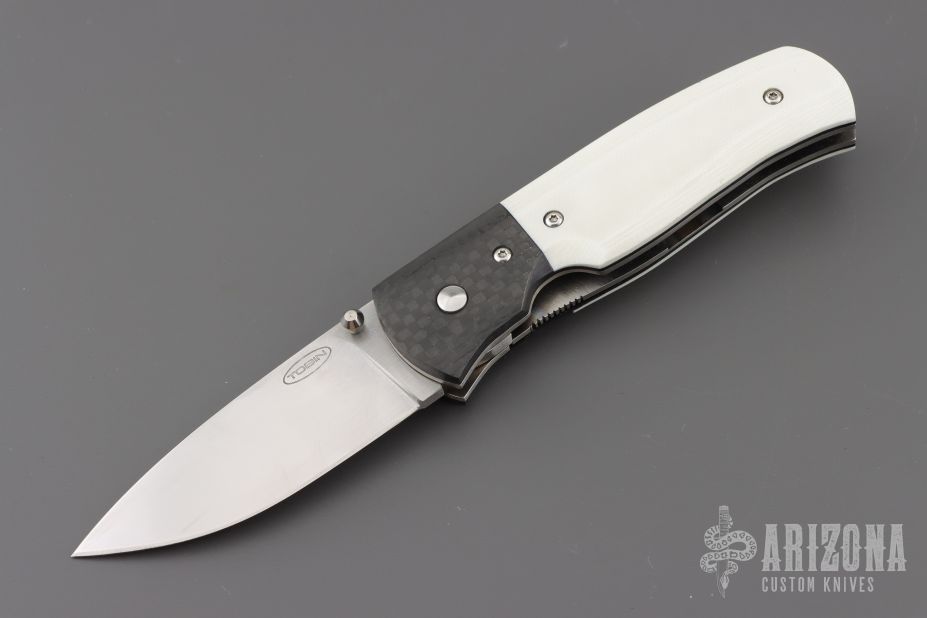 This knife by Tobin Smith features a hand rub satin finished blade with single thumbstud. The handle has carbon fiber bolsters, white G-10 scales over black G-10 liners, titanium liners and a matching tip up clip, three-piece backspacer. Nice detent, lockup and blade seating. Comes with COA dated April 2014 and original box. Has a few light scratches, otherwise the knife is in excellent condition.